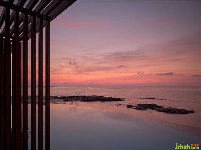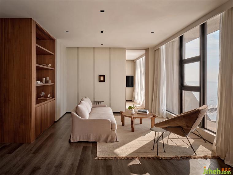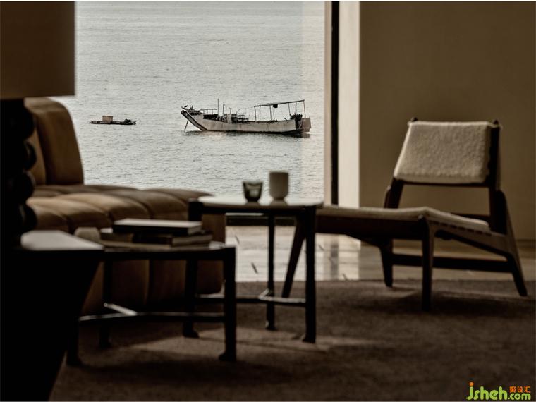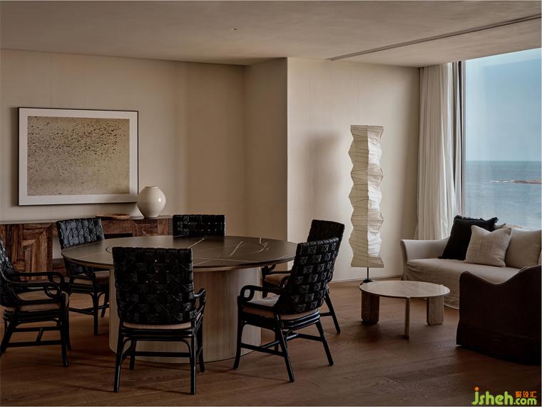 酒店设计延伸并保留至大堂的原始礁石,是被自然赐予的礼物,成就了空间的氛围主题,通透的弧形场域,为人在进入的那一刻,感受时间沉淀的静谧,设计将重点放在结构和材质上,纵向分隔的楼梯成为一组打开的画卷,大体量的石块成堆叠之势,与海滩的天然礁石形成对话。石柱、石材、礁石形成新的秩序,保留check-in的功能之外,以退隐的方式凸显质朴的自然,站在窗景前,如同泉州三湾向大堂展开拥抱,人们在此寻找庇护和独处,收获巨石之下肃穆的诗意之美。