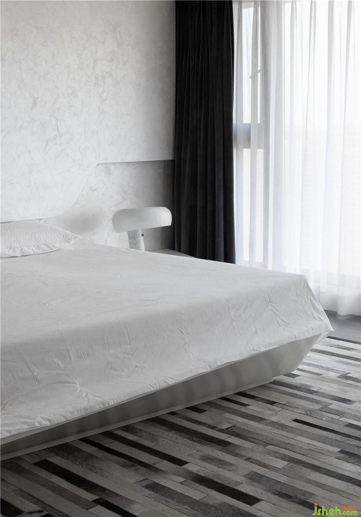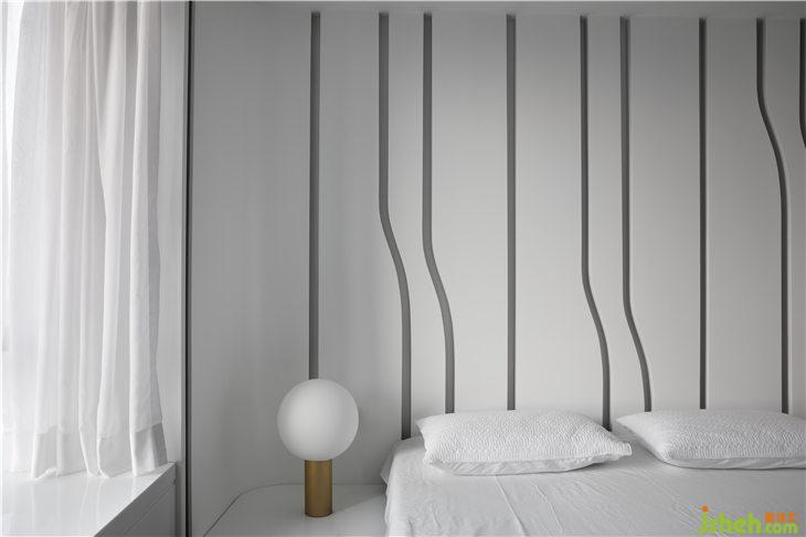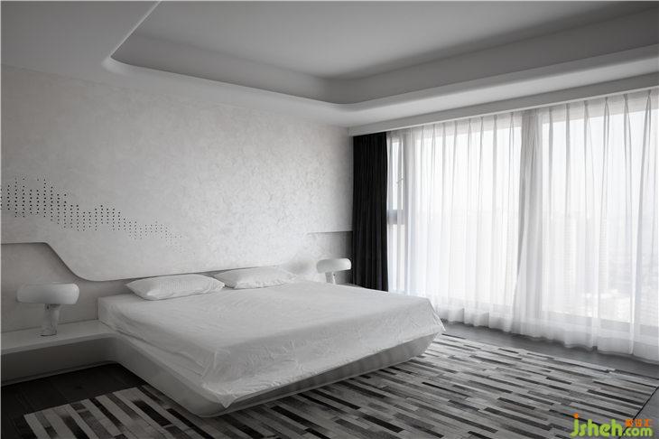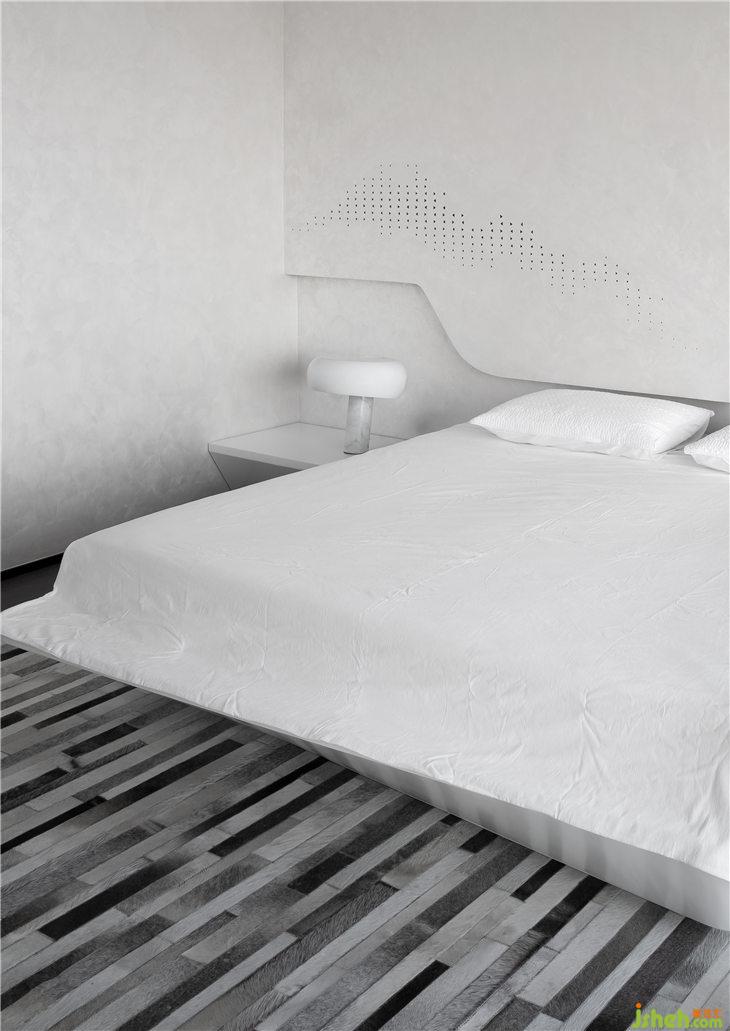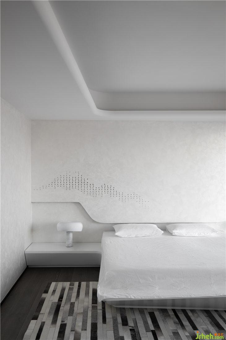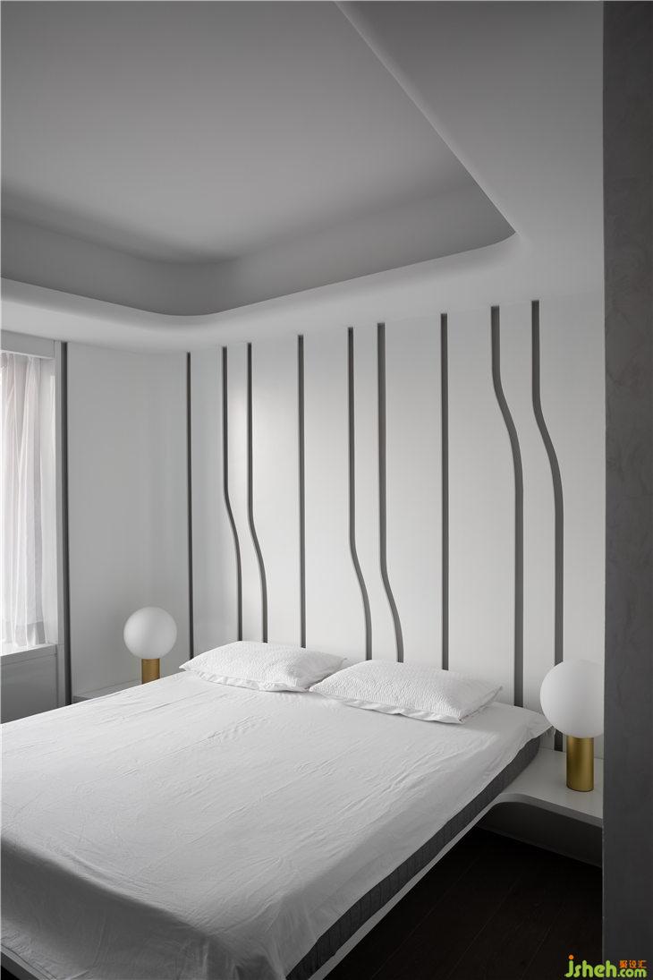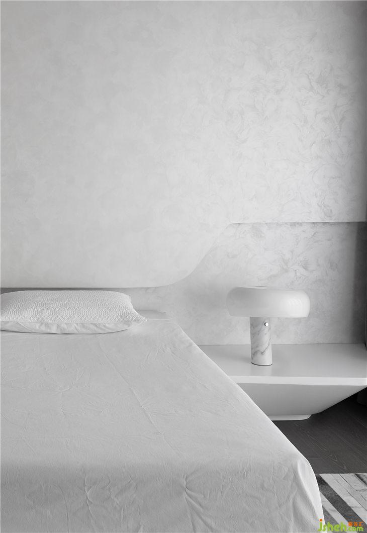 卧室以白为向,弧线与客厅的元素相呼应,和谐统一。白色的天花、墙体、床品搭配黑色木地板,结合灯光设计,营造动静相宜的空间环境。