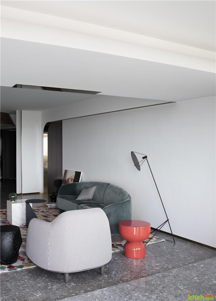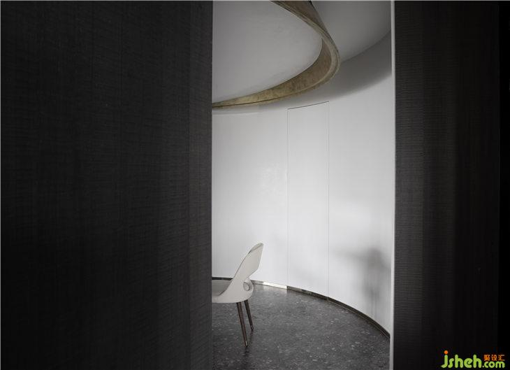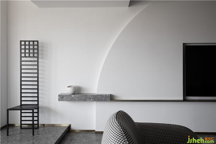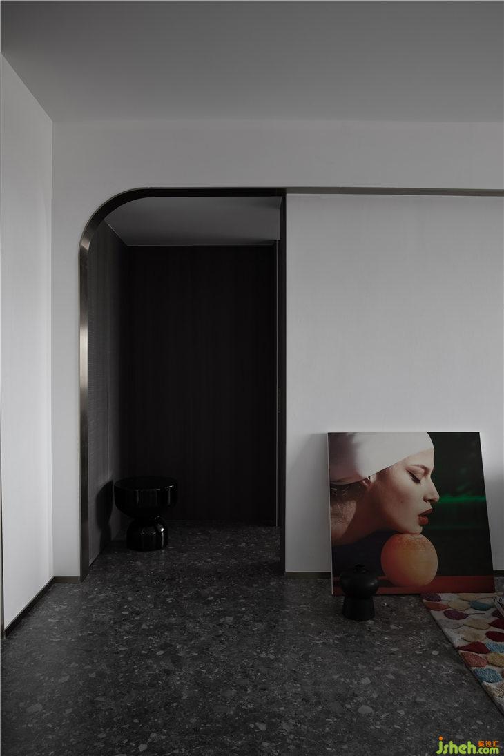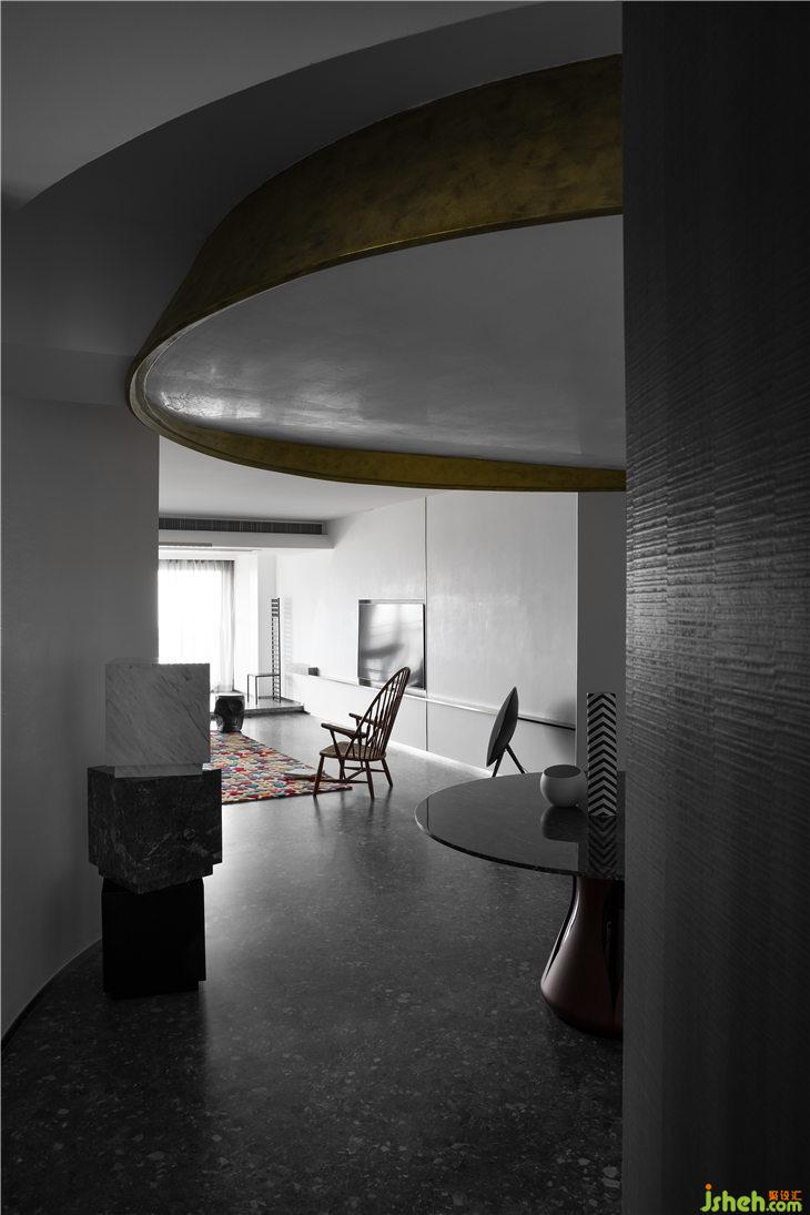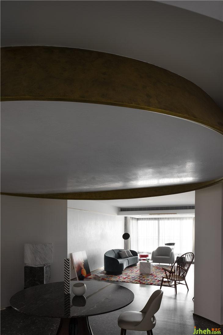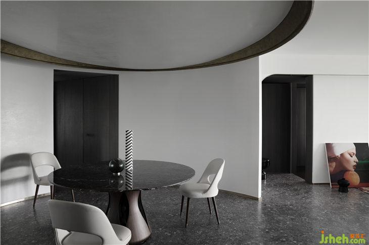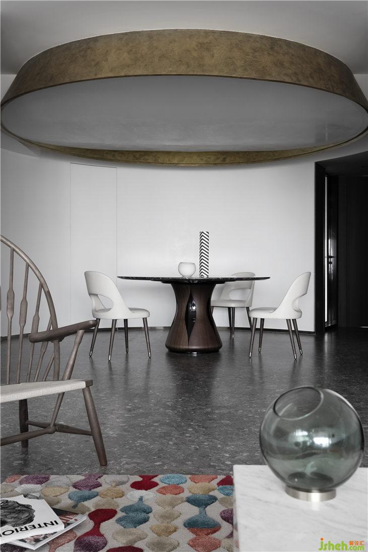 客厅空间立面以白色的艺术漆为底,立面的弧线线条来呼应餐厅的圆形,强调空间的线与面的关系,通过弧形线条重塑空间的构成美学。深灰色水磨在居家空间的运用,更加彰显空间的独特。平天花更好的突显餐厅圆形的天花线条,同时有力的拉升了高挑的空间感。餐厅与客厅一气呵成,互相融合。构成一个热闹的大家庭。我们可以想象人与人之间其乐融融的生活情景。黑色的QEEBOO骷髅边桌,色彩斑斓的土耳其进口地毯等软装配饰,无一不是在强调空间的俏皮与精神性。