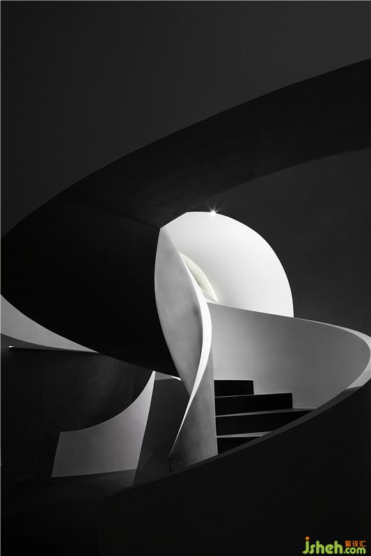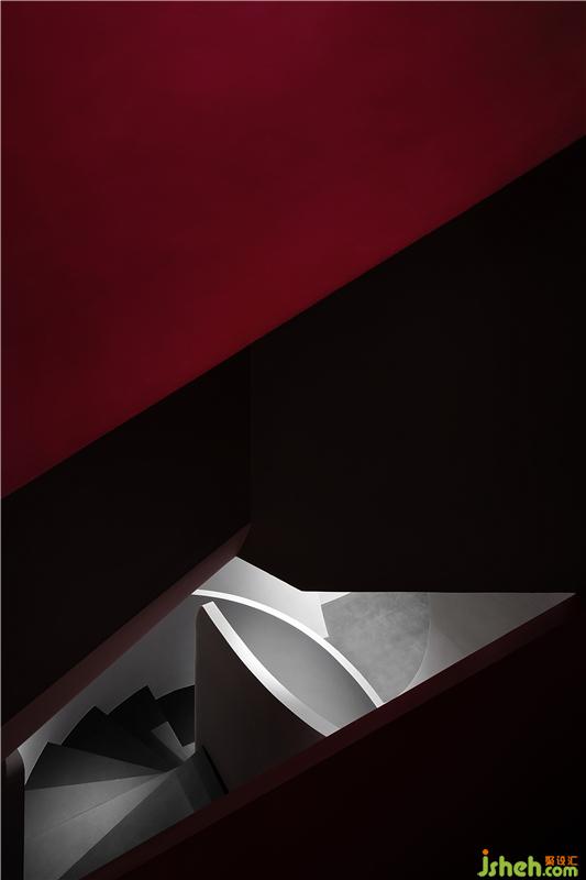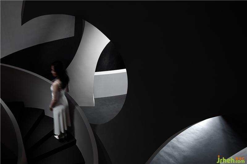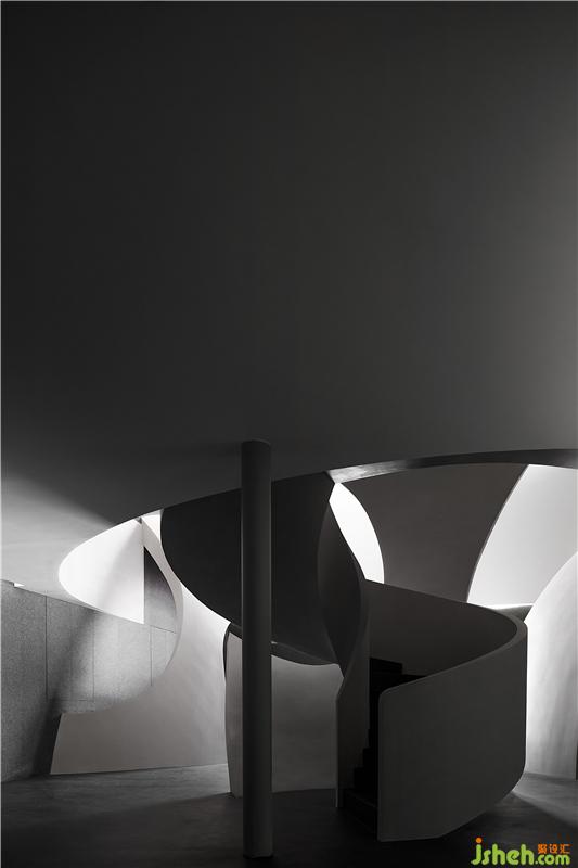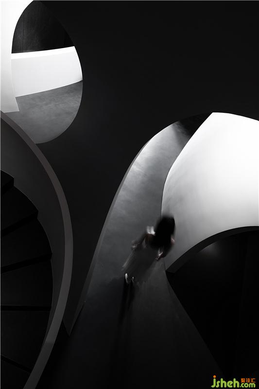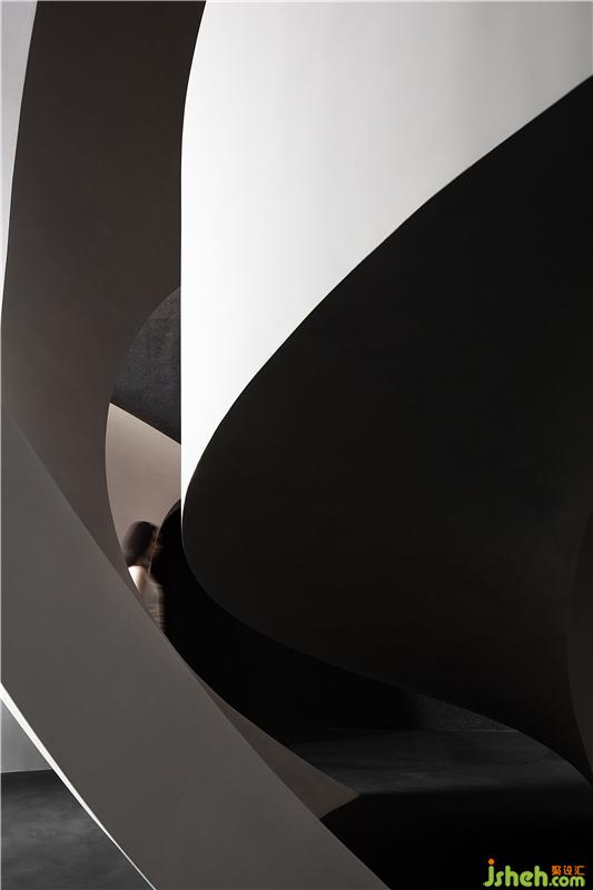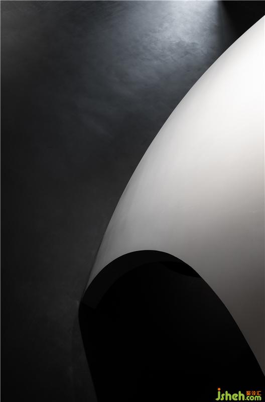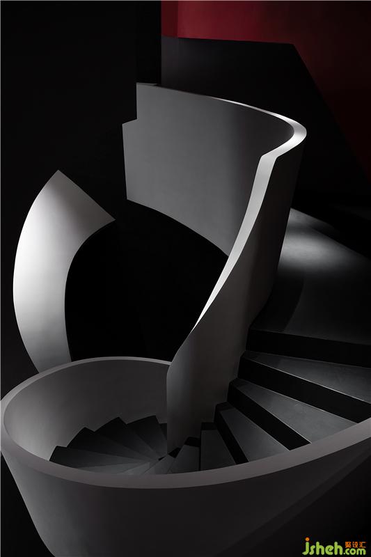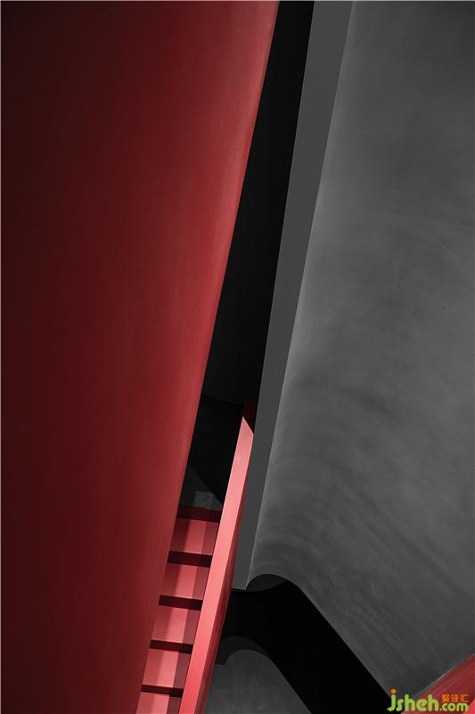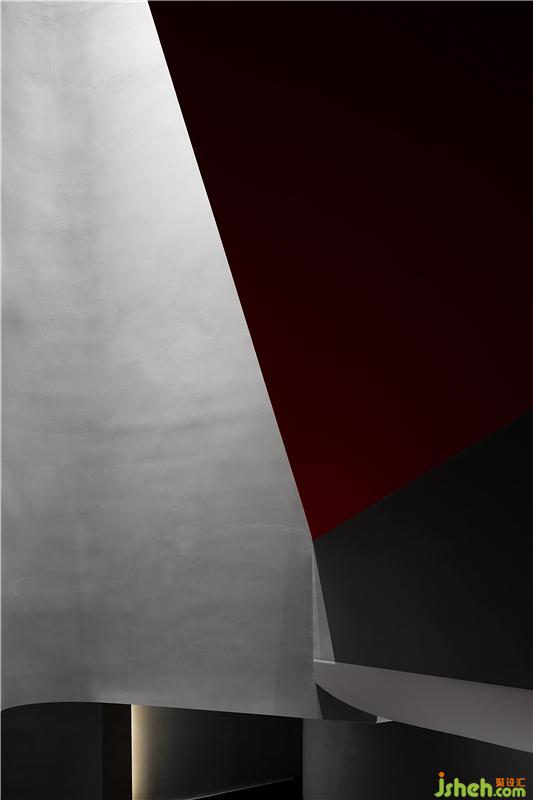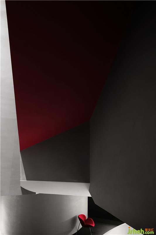 灰色与黑色铺构的空间基底中,暗藏一抹热烈的“红色”,色彩上的突变,成为空间造型之后引爆空间张力的第二个高潮。色彩应用的巨大反差极具引导性,同时为进入者留下深刻的印象。
