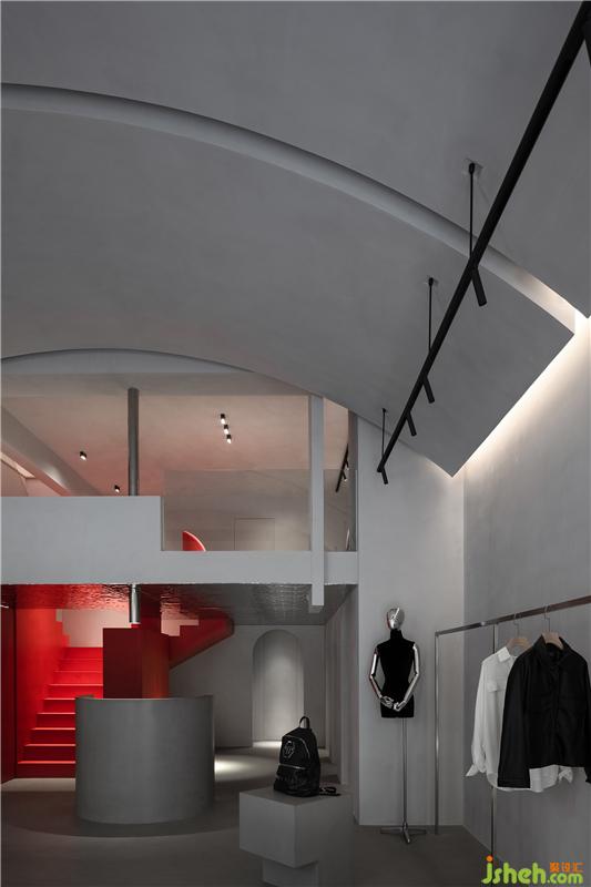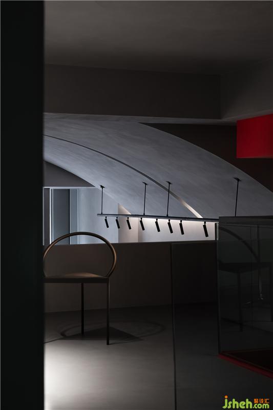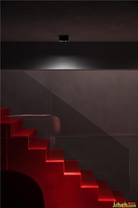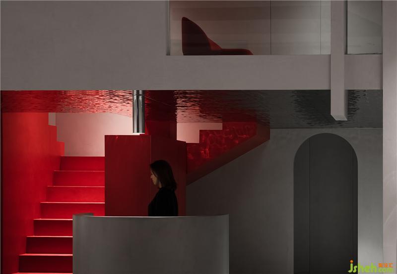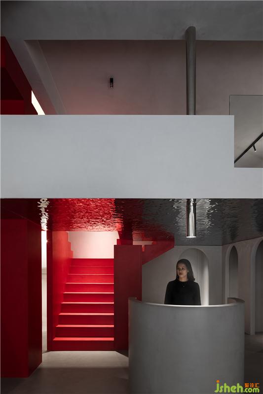 在扁平化的时代,室内空间我们也采用了扁平化的设计理念,空间六面体用同一种材料来阐述,降低空间的立体感。红色楼梯充当空间的垂直流线,同时成为整个空间的视觉焦点。绚丽与清淡并置,激烈彰显物象张力,在周遭嘈杂中营造一方宁静与热烈亲密相偎的场所。
