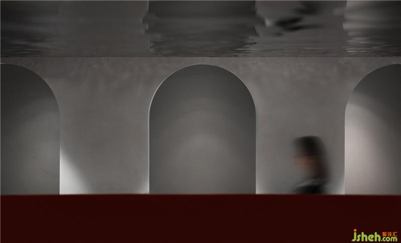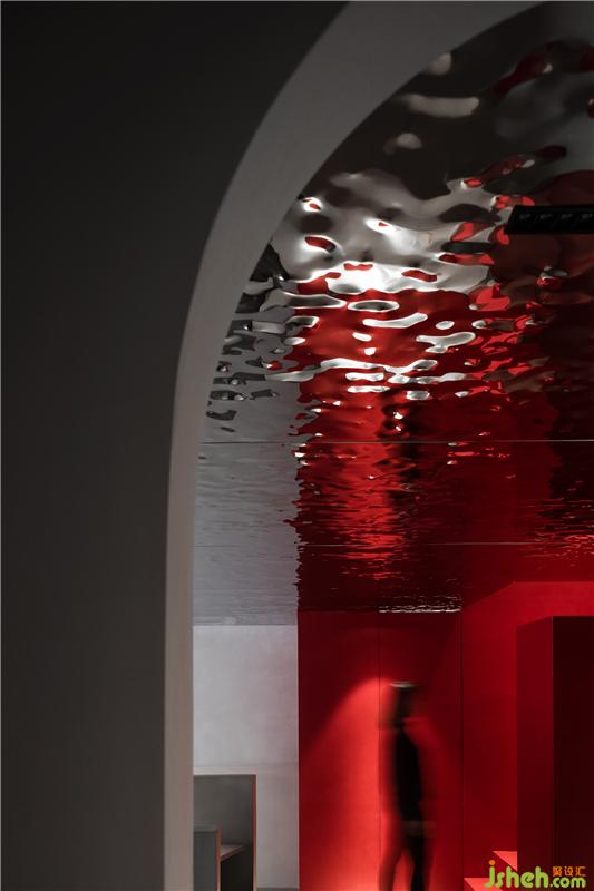 几何形于弧线的组织,构成了空间丰富的表情,于视觉错像。整体空间用守规矩的方体进行阐述,顶面以及更衣间的弧形门洞打破了空间的平静,并且给空间带来了女性调皮的性格。夹层只有2.2米的高度,装修设计空间采用波纹镜面质感,解决空间压抑的条件,模糊了空间的界限。