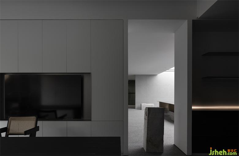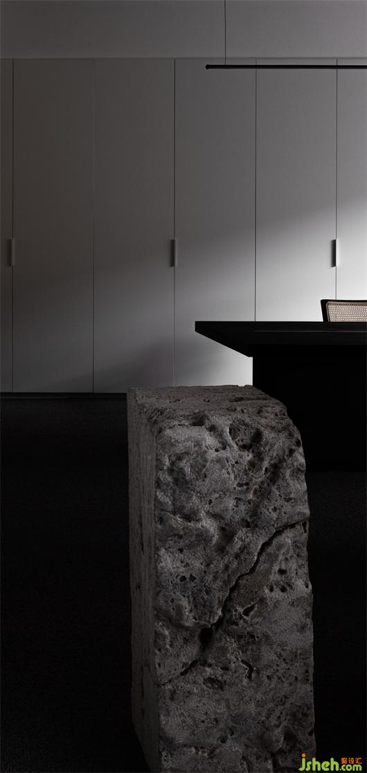 空间的中心由两大部分组成,产品展示位于进入空间的左侧,简单中强调秩序,通过产品展示来强调空间的序列感,强调产品的美学理念。不锈钢与自然石头的展示台,初步诉说到了产品定制的核心理念,右侧为办公区,简洁的办公功能搭配背面木饰面活动样板展示,简洁大气。