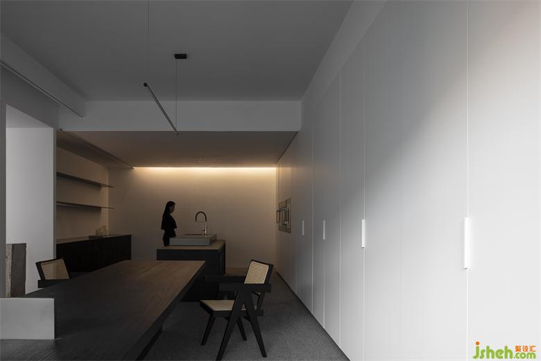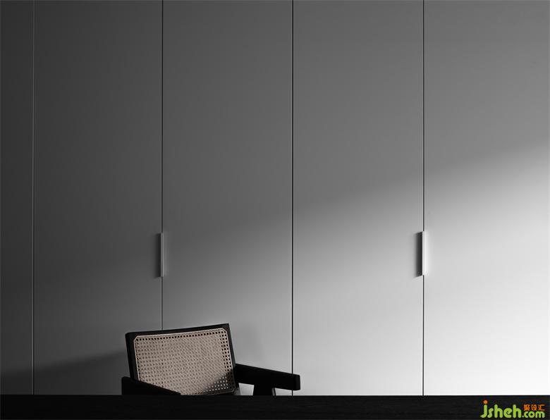 进入空间的第三个部分既是接待区,空间立面是柜体的展示,虽然空间较小,却将厨房系统、衣柜系统、酒柜系统、鞋柜系统以一种统一协调的方式一一陈列展示出来。展厅设计空间的中心是一张定制的接待台,是一个拉近人与人之间细腻关系的中心,这是一个私密与舒适的过程。