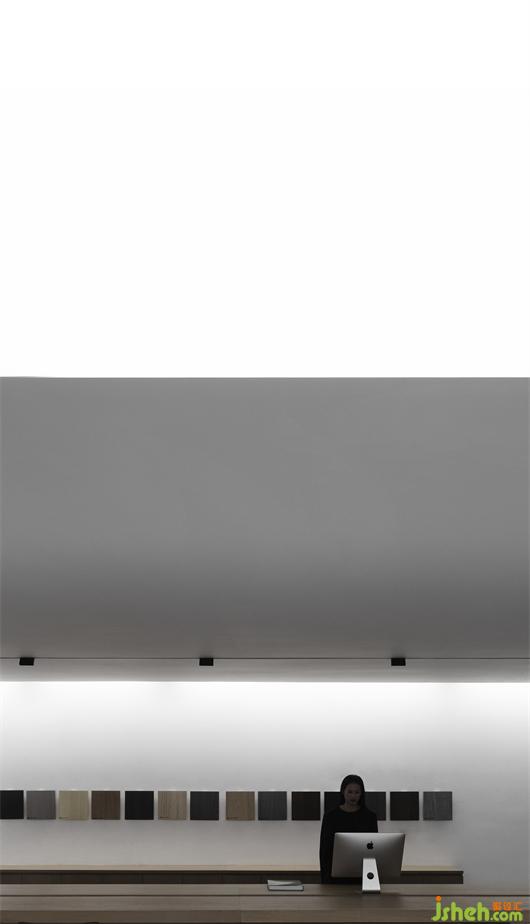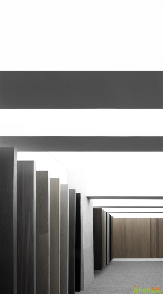 The wooden veneer display & office area occupies the central part of the space. Products display is arranged at the left section inside the entrance. This simplistic space presents a sense of order through products display, and highlights the aesthetic of products. The unique display stand made of stainless steel and stone implicitly conveys JIEN's core idea of product customization. The office is on the right side. Concise working functions are integrated with a backdrop of movable wooden veneer samples, showing a simplistic and neat image.
