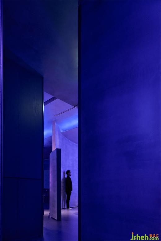 围合的弧形墙面其意在社交情绪中产生安全的距离感,一方面在给单独的社交场所以物理形式做出阻隔,另一方面,其物理状态下呈现的虚张、力量、与冷调光影的晕染下,所形成的感知是迷幻的、先锋的品牌基调。