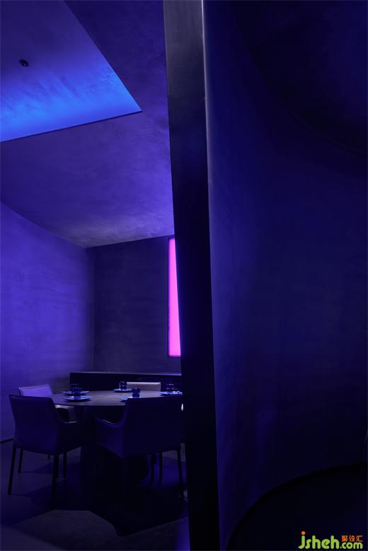 中间散台区,其内在的情绪决定了形态外延与向上的张力,这种张力是制造场域的聚合的一种力量,艺术餐厅设计与其环绕更激进的状态激发用餐者流露出放开、社交甚至激昂的情绪意识。吧台区域晕染传达的细微的光影,也揭露出窥探与空间的互动的感受。