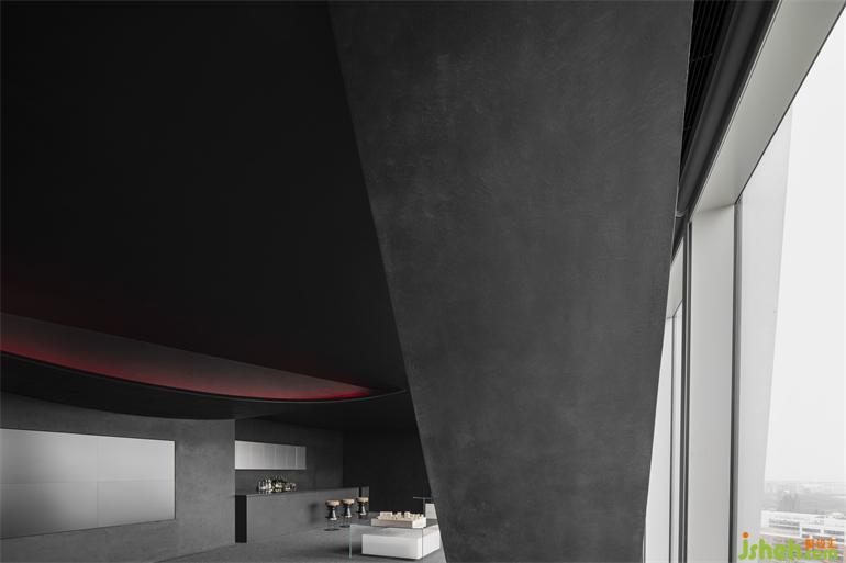 物料展示区常规逻辑是最杂乱,私密的区域。这一切都源于不安,源于我们想要遮丑的内心。我们将物料展示用肯定的态度,设置在空间的中心,同时是入口的位置,办公会所设计中心能够带来高效的工作节奏,即合理性。同时展示着这些有关美的表情。表达着我们对这种不安的挑战。