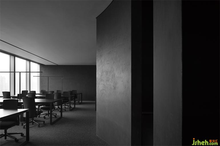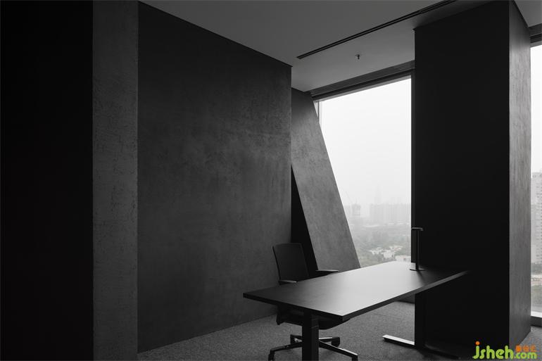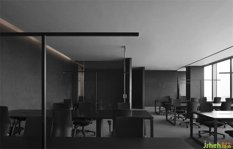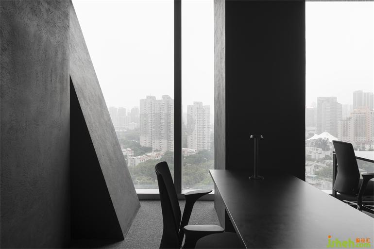 暗黑色系的办公室,这是一个具有争议的状态,另我们惊喜的是,这样的暗黑系,办公会所设计更好地将视觉引到室外的美景,更好的与自然进行互动。简洁的材料体系,黑色洞石的效仿意大利艺术漆,体现了空间的份量感,德国芬尼特地毯的运用,强调了舒适度、吸音及特殊的地面质感,不锈钢与灯光的结合,强化了空间的科技感与场景感。