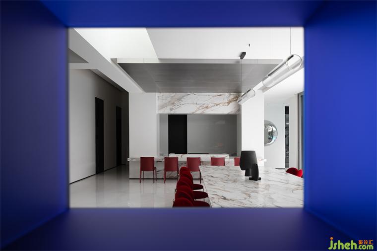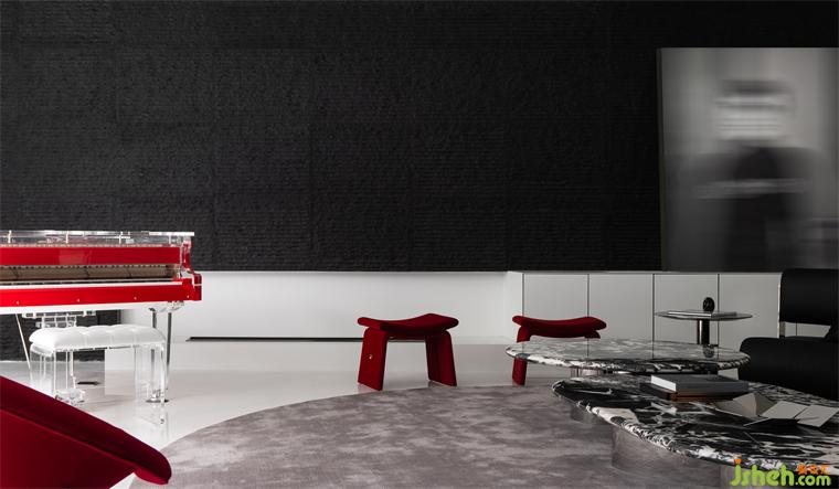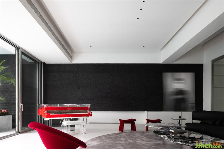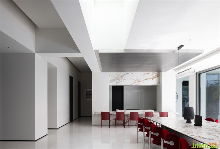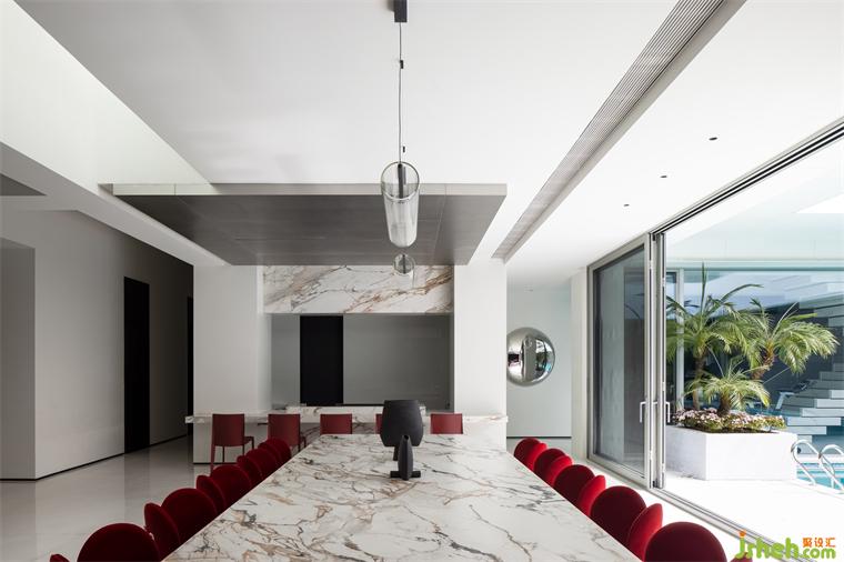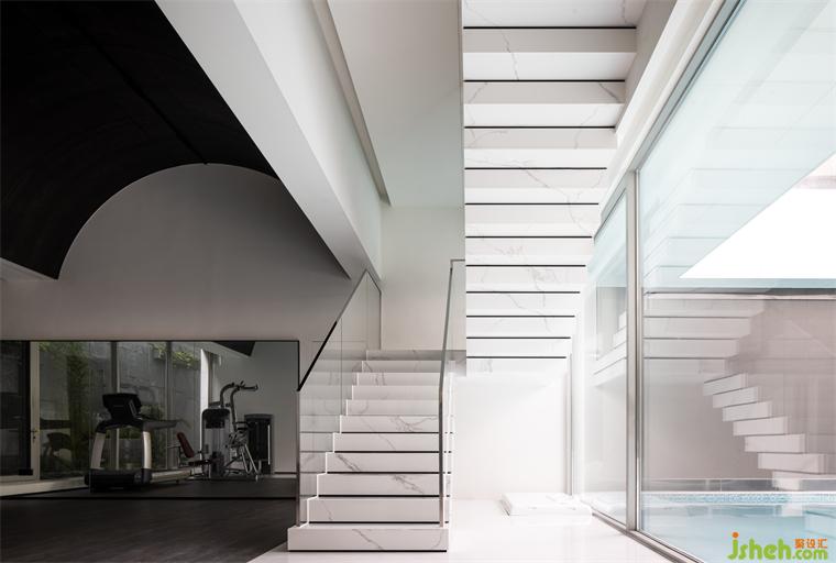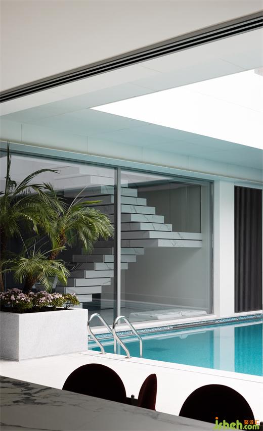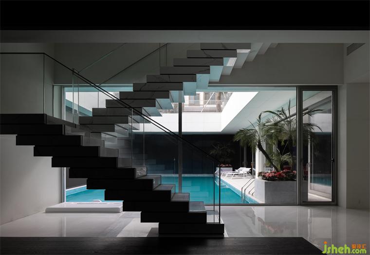 置入泳池,并在其上方创造一个天井,极简豪宅设计将外界的阳光与空气吸纳至负一层接待空间。