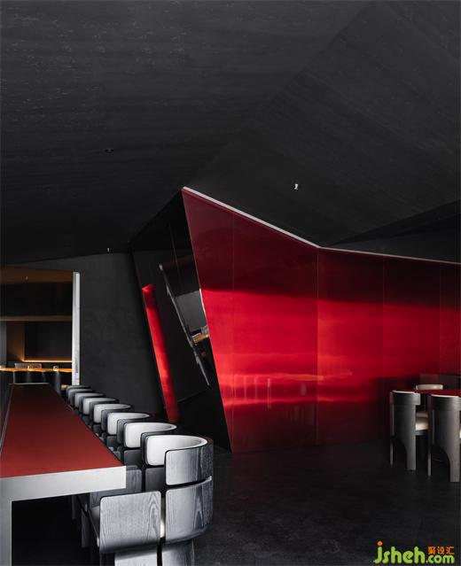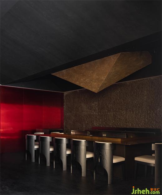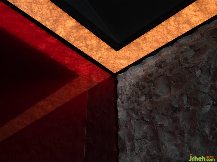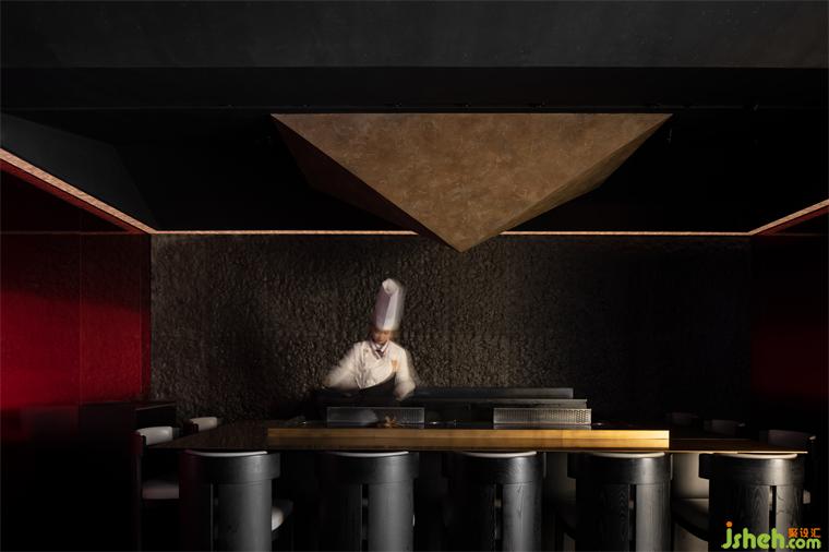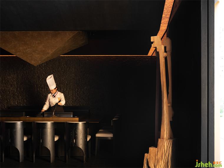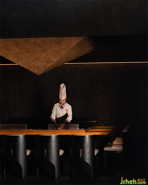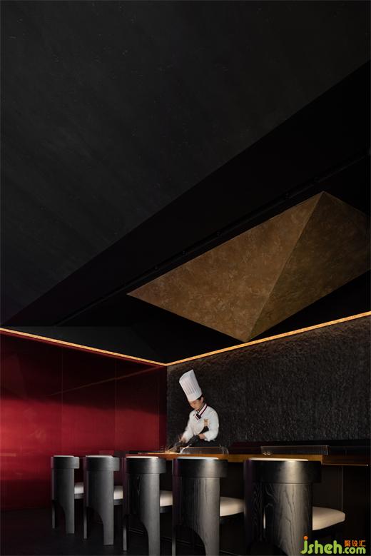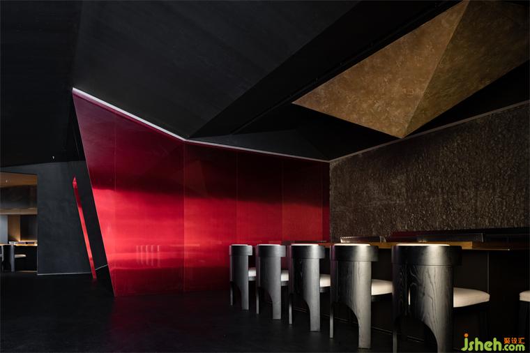 华灯初上,灯火一星一点亮了起来,门上的“虹”字LOGO面向灯火辉煌的商业区,反射出灿灿金光;铁板料理设计像是黑暗中出现火焰的光亮,影影灼灼,引导着寻访来此的人;光影交落渐淡渐现,又平添几分望不穿的朦胧交织与神秘未来感,户外就餐花箱区植被为产品动线赋予氧气。