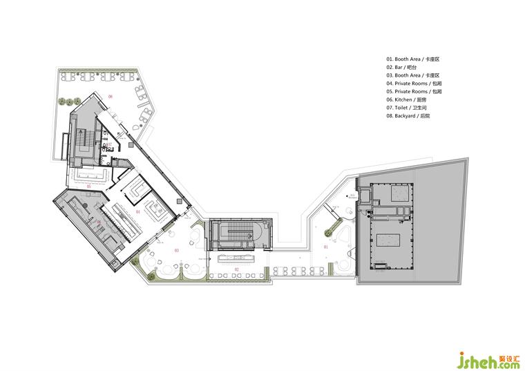 “天堂”与“地狱“诠释了血腥的美丽,这一化学分子在空间的一帧一镜中升华场所。开放式大厅分布着的就餐区呈异形开放式布局,在社交情绪中营造安全的距离感。一方面在分段式社交场所做出回流动线铺设,另一方面,空间在其高雅、混合、与混沌光影的晕染下形成混沌的雅奢品牌基调。空间整体基调呈黑红,Omakase首个操作台设置在餐厅的中心,是餐厅的第一个功能视觉焦点,服务于餐厅全部桌席的附属功能,选择了离每个区域最近的位置,铁板料理设计满足功能性的同时强调一种开放式神秘场域的空间情绪。与很多日料的平和不同,这是一种幽静与美好,嵌入了现代日式传统的另类精神。