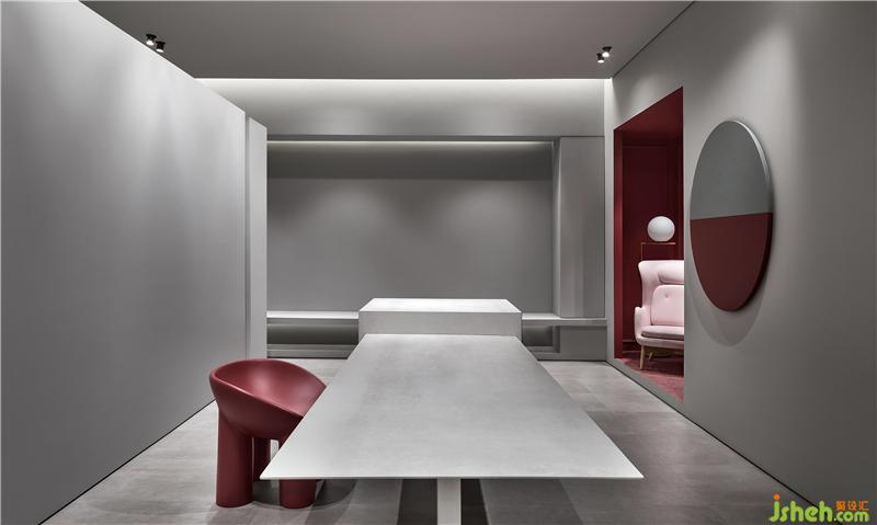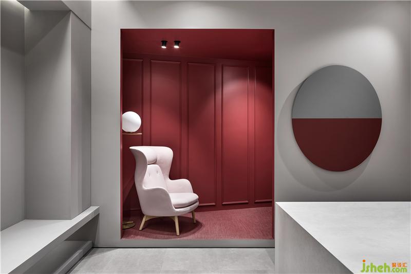 热烈的红色系填入内嵌式的展示位,与素净的家具形成冷暖对比,犹如电影镜头里的布景片段,却又是真实可达的线下体验区。