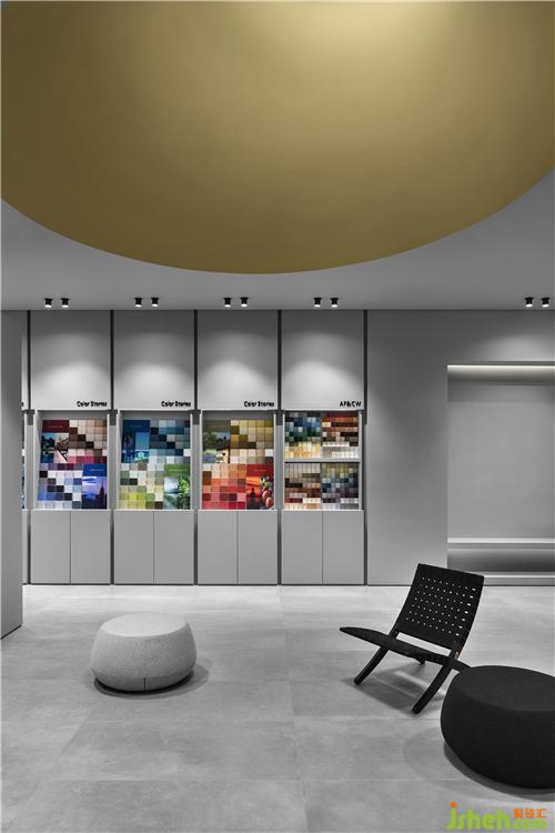 The circular vocabulary also extends to the yellow structure of the main space, which gives out the impression of ceiling inlaid with unique articles, forming a magnificent installation art. Light sources are introduced to create the daylight effect to naturally sublimate the ritual atmosphere.