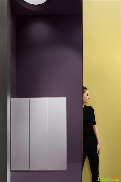在用色细节上进行细腻拿捏,以平衡与中和代替了强对比。高饱和的色彩抹上一层灰度,淡然而诗意,让整面墙的大色块不致空间丝毫局促或压抑,反而平添温暖亲和的质感,在灯光的晕染下泛起五彩涟漪。