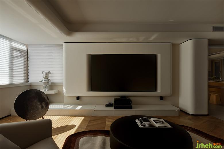 原木色的木质材料与米黄色的墙纸是营造空间温和安逸基调的重要材质,花园叠墅设计弧形线条与弧形转角使空间视觉看着灵动有趣。
