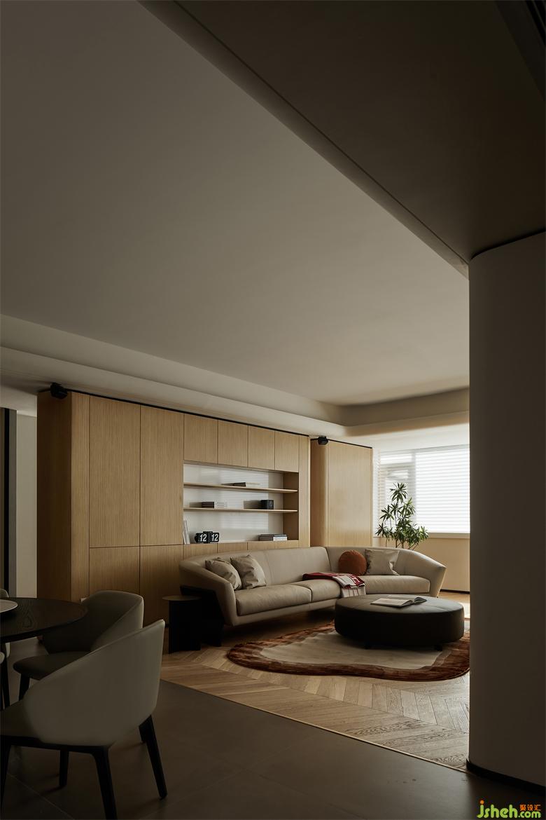 Wooden material covered up by burly-wood together with beige wallpaper are important materials to build up the mild and relaxing atmosphere inside the house.The curved lines and corner make the interior space interesting in sight.