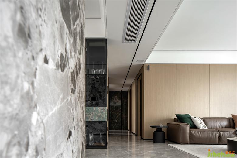 The slate carefully selected by the designer embellishes the space, supplemented by matching lighting, you can clearly feel the unique charm conveyed by the stone when you enter the room. The two different slate colors form a strong visual conflict, which not only clearly distinguishes the functions of the space, but also fully declares the sense of ritual of returning home. The poetic nature of nature is intertwined with the texture of light luxury, and the artistic aesthetics and the quality of life complement each other.