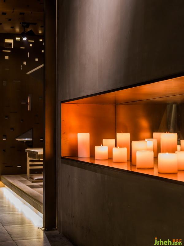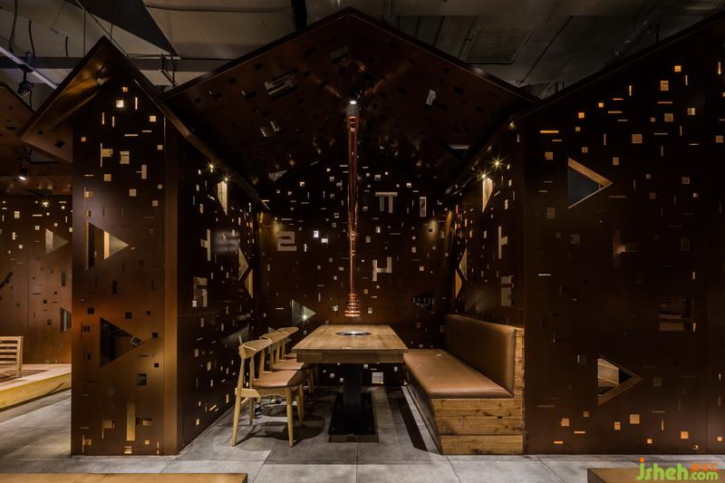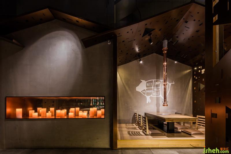 在这里,锈板和锈红代表传统,水泥和灰色代表现代。这是时间的交叠。与烤肉不可分割的烧酒文化,以一道绿意晶莹的酒墙出镜。这就是文化的暗喻。