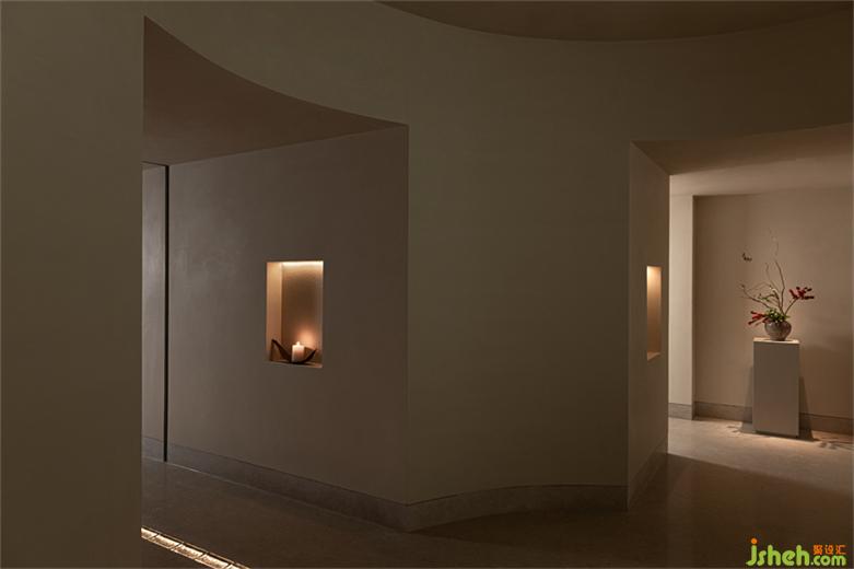 拱形天花板,米色石材平顶地,呈现出几何本质的美感之余,SPA设计整个空间显得如此的空灵、静谧。空气中弥漫着茶叶香薰气息,细细鸟鸣与流水声无限回响。设计的用心之处,正是调动了视觉、嗅觉、听觉、触觉等感官,使人内心平静下来,深陷空间幽静安宁之中。门徐徐关上的刹那,实现自身五感的觉醒。