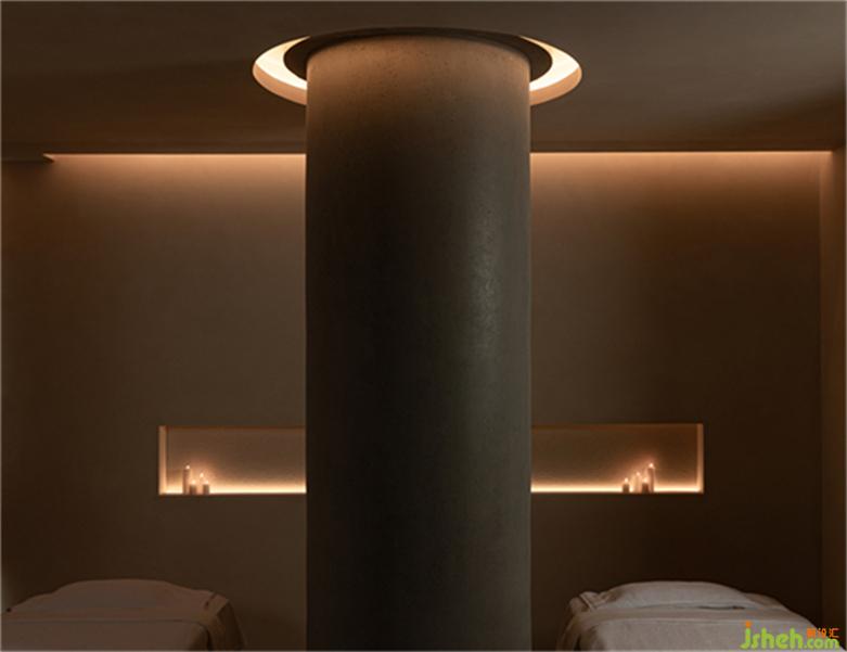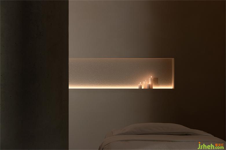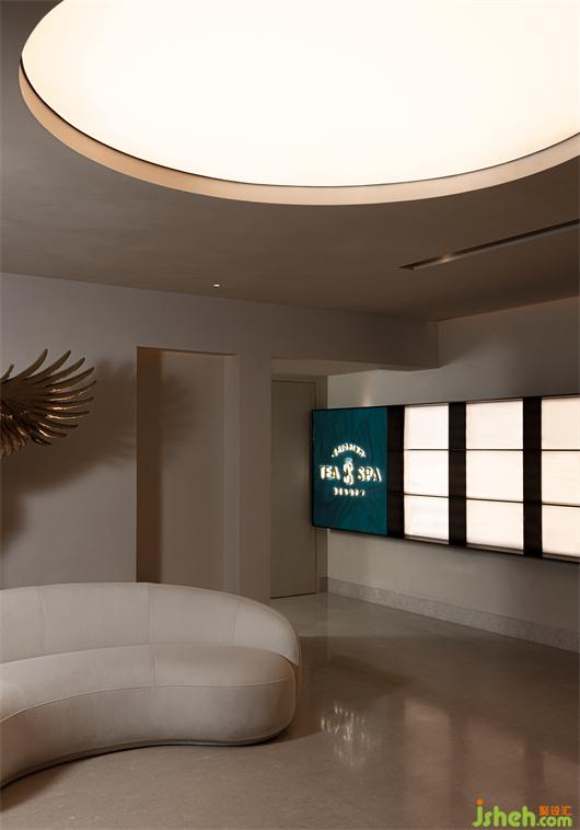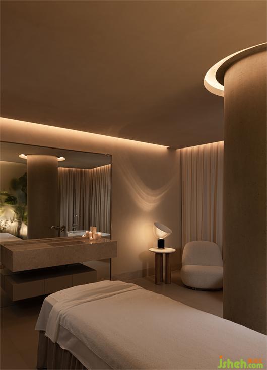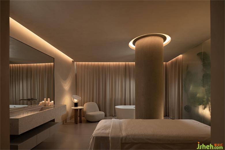 一束阳光穿过白色纱幔,融化在水雾之中,SPA设计将记忆拉回到那一方尘土。水晶砖、原木、原石、室内留白和浮光掠影,让空间无形中生出神性的侘寂之美。