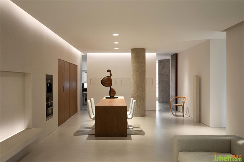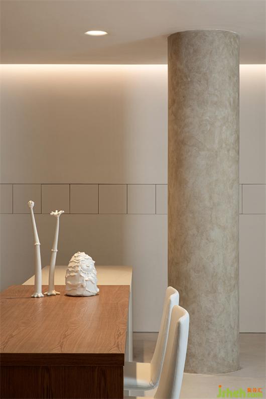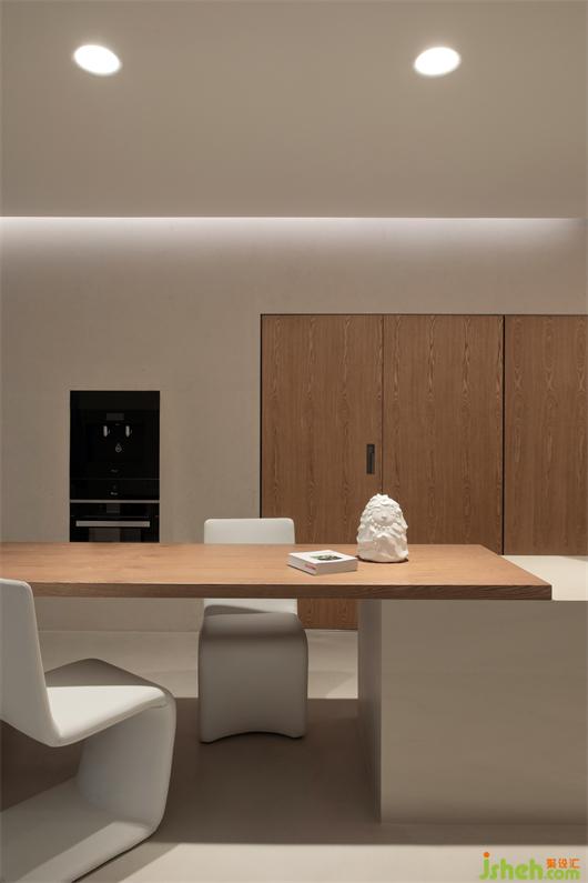 宽敞明亮的开放式厨房也很有艺术气息,原木与水泥组合的定制吧台、整体隐藏式橱柜、以及白色餐椅让整个空间变得极简大气,极度舒适温馨。