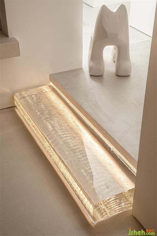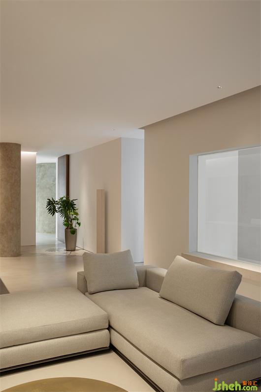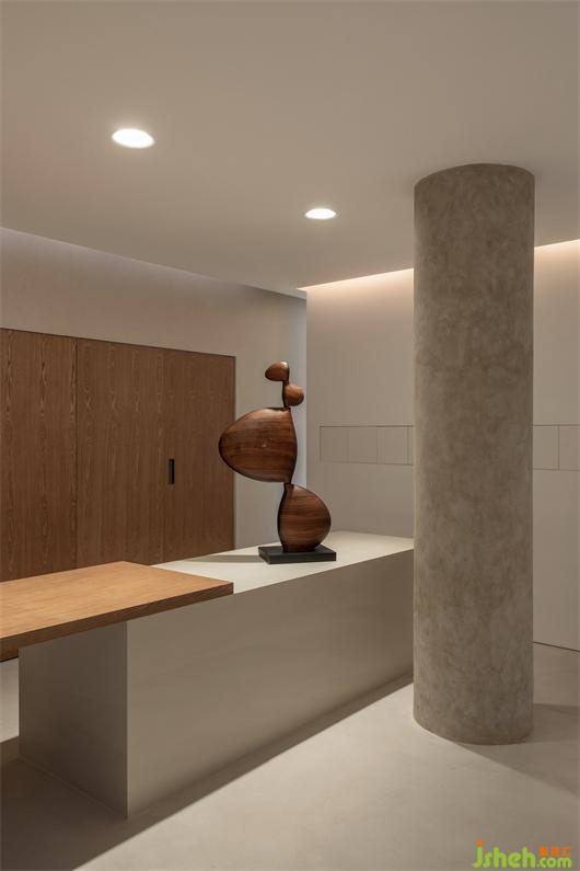 整个室内所有布置都构成一种既对立又统一的手法,客厅中沙发采用的是沙色麻料,茶几则是黑胡桃与古铜的搭配,壁炉则以铜板镶嵌,书房金属书架彰显着品质感。展厅设计在清水混凝土的底调下,所有的物品都有着各自的性格和特色。
