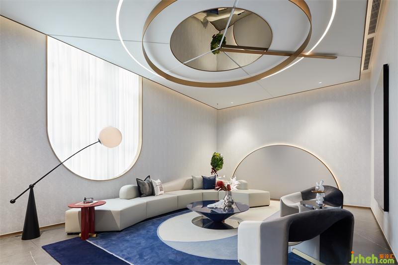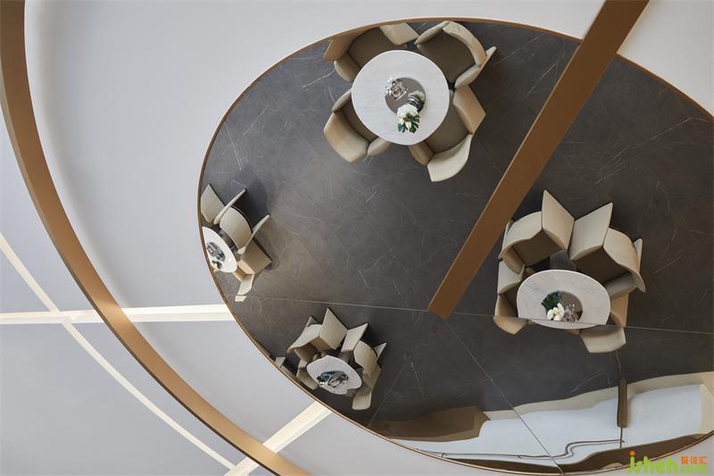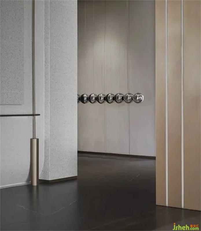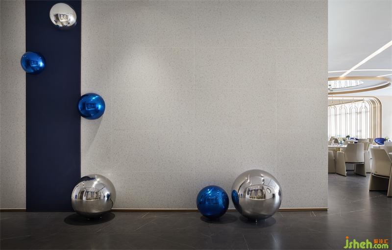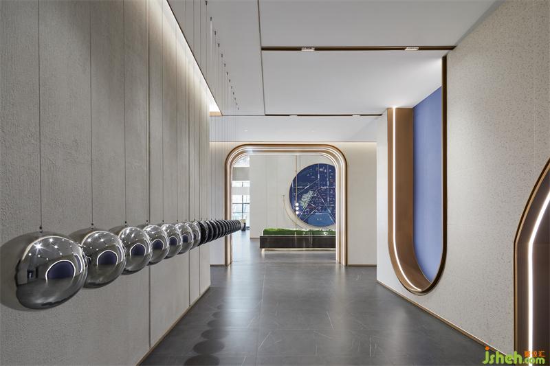 财务区硬装墙面造型丰富,设计师以细腻的思考策略,售楼处设计将镀色的不锈钢圆形与半圆形球体结合,在艺术化的表达下从地面自由延展到顶面,形成空间视线的律动感,赋予空间生命力。