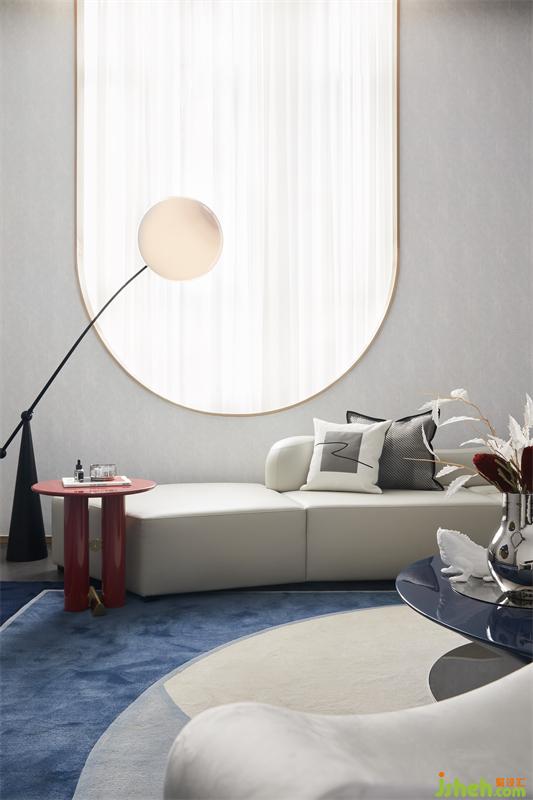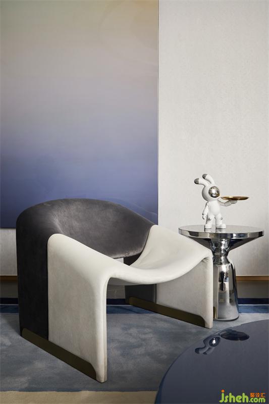 艺术的张力来自于多种色系与几何形态错落有致的搭配,梦幻的蓝色与跳跃的橘红色,绘写出空间优雅丰富的意象,而光在穿越玻璃引入室内后,空间更显时尚前卫,形成了一种独特的立体感。