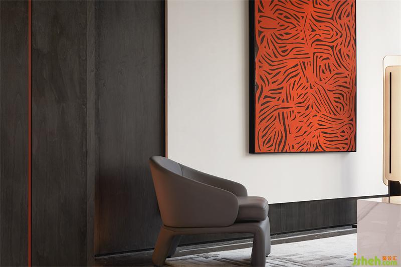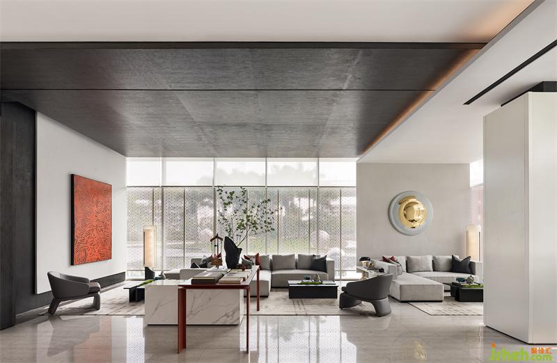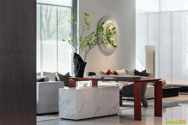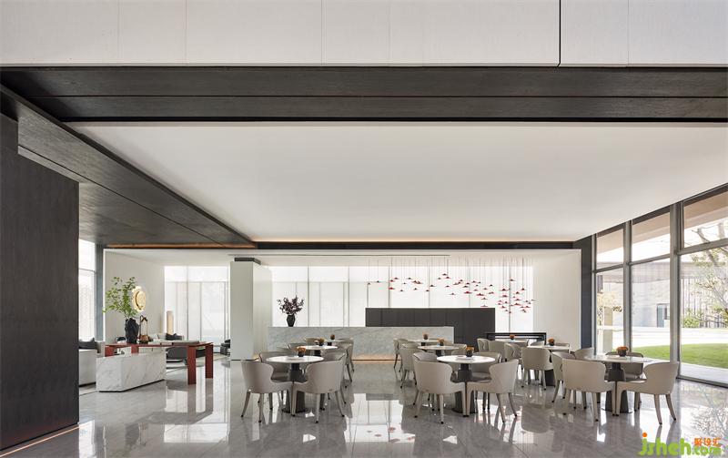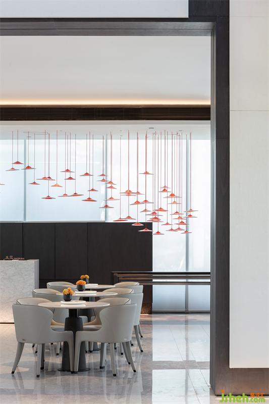 园林的湖水化作一帘红雨,售楼处设计传统与现代静默交织,为素雅的空间增添灵动之感,让人在自然行进之中,感悟艺术心境。