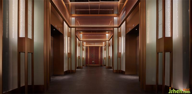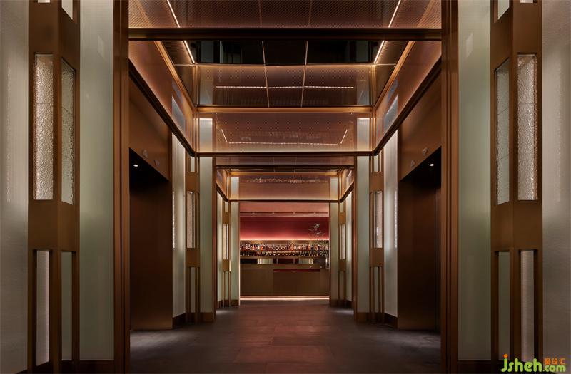 餐厅设计立柱的腰端镶有薄冰似的光柱,光与影的交互形成斑驳。电梯厅共分为三段,由完全相同的小厅组成,随着行进的方向,三组音符落下,开启我们的寻味之旅。
