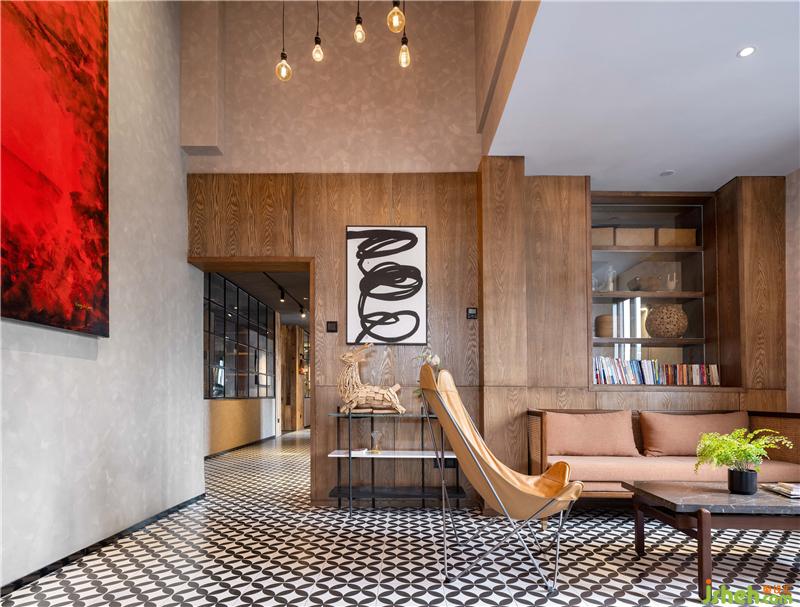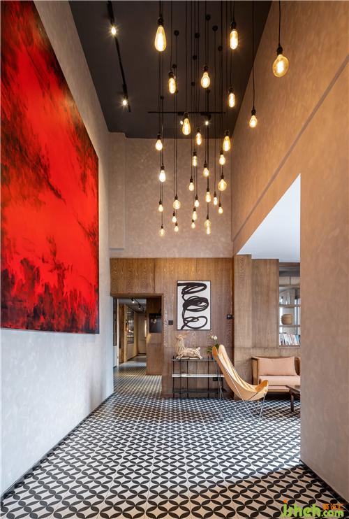 乘电梯至6层,再步行到楼顶是餐厅与健身房。空间环境的设计,要满足人身心灵的需求,7层前厅的艺术廊,红与黑巨幅艺术画、数十盏钨丝灯、一颗绿植都蕴藏着深层的情感内涵,为我们构建出丰富的内在世界。
