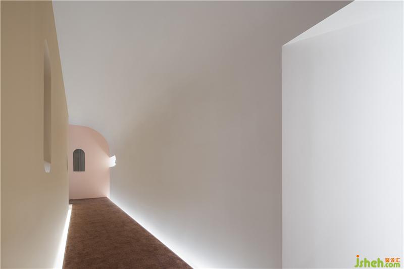 穿过拱形门洞,接待台后侧是水吧与休息区以及儿童娱乐区,我们希望这里除了休息、接待功能之外,也是一个可以满足儿童娱乐的区域,让家长、小孩在此能各取所需。