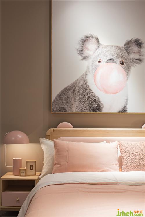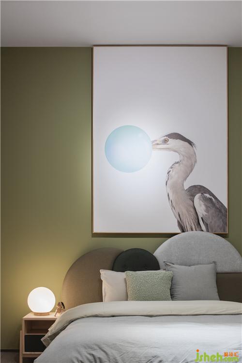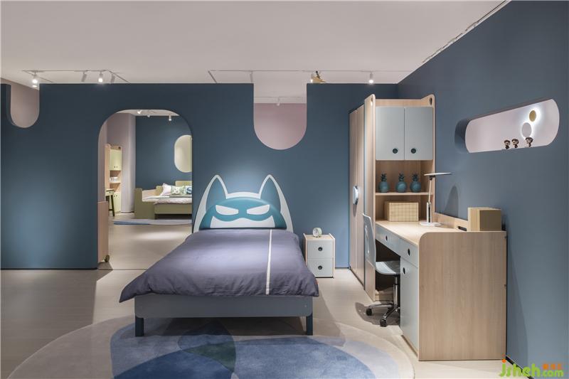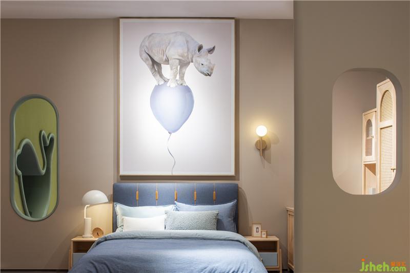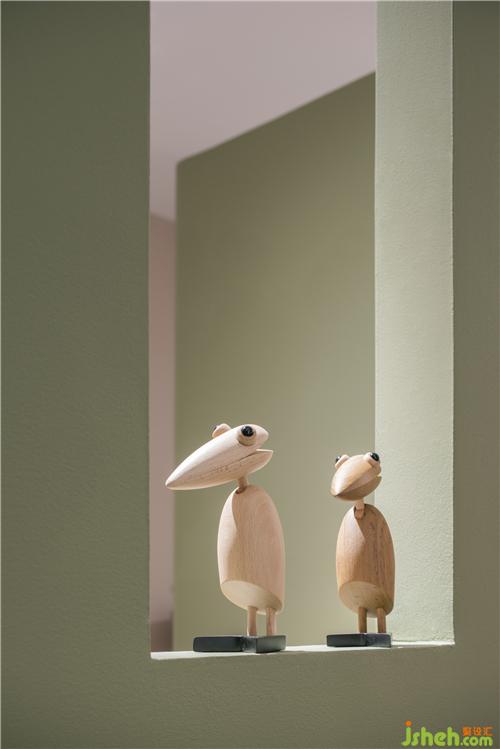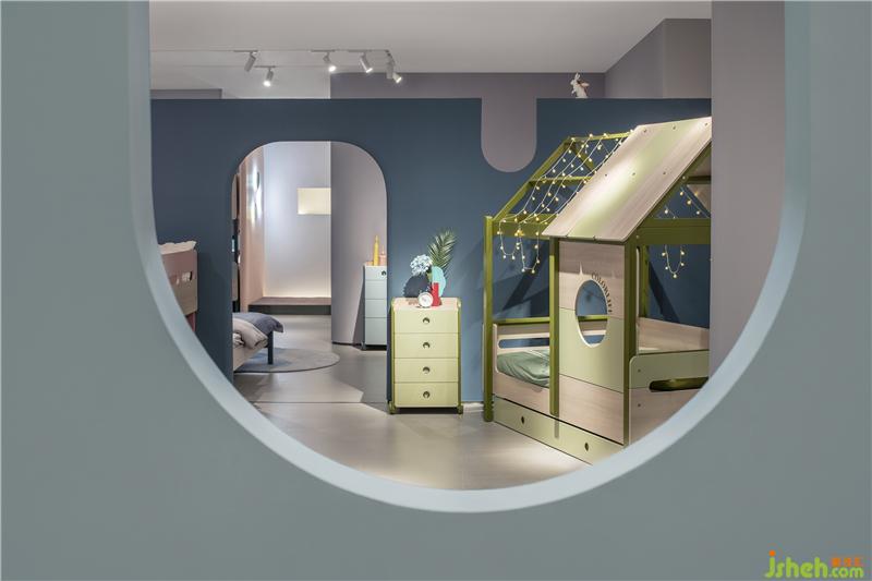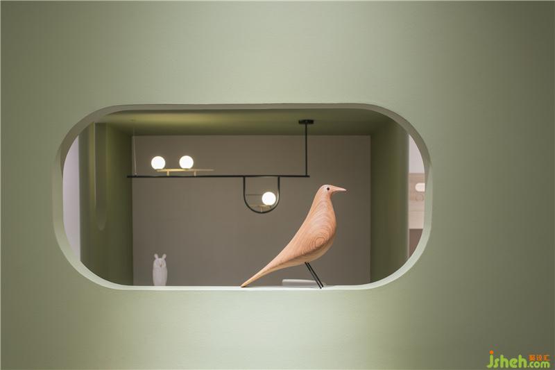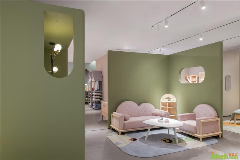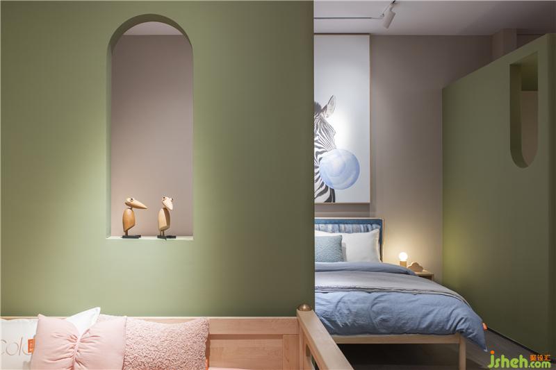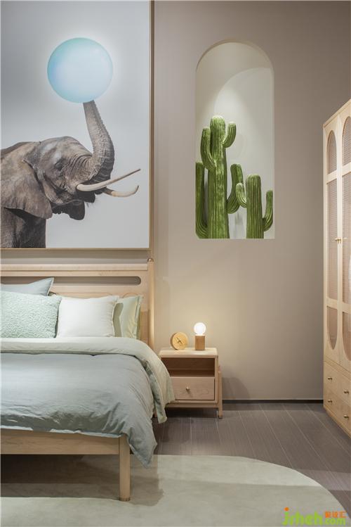 穿过床垫区可见一柔和氛围,这便是原木家具展区,原木有着天然的亲和力与温润的质感,墙身选用象牙色让空间变得安静,枯绿色的雕塑墙丰富了空间层次,配上俏皮可爱的动物画、动物小木偶,家具展厅设计让宁静而轻松的空间氛围添了几分童趣。