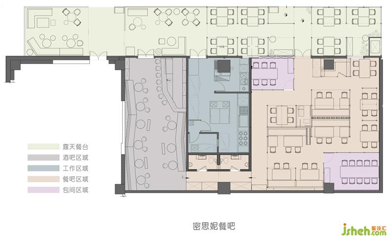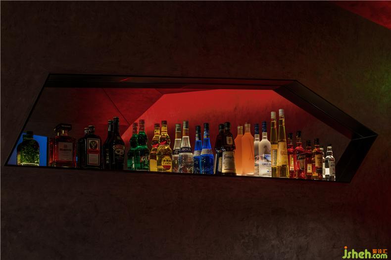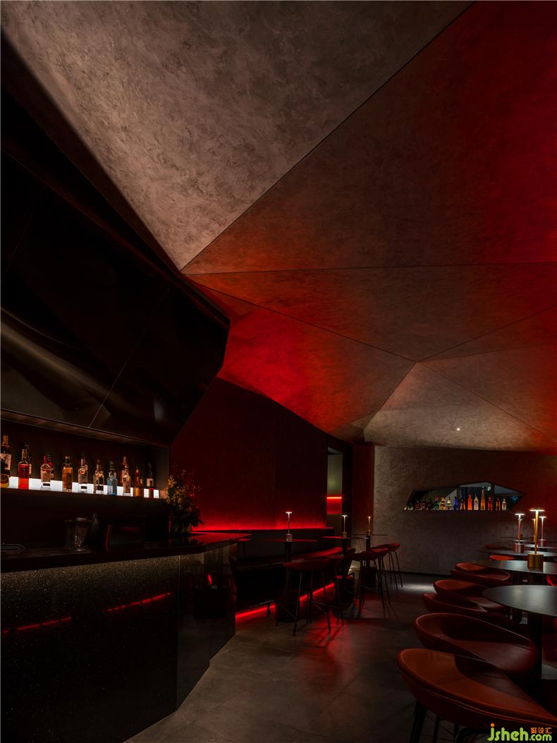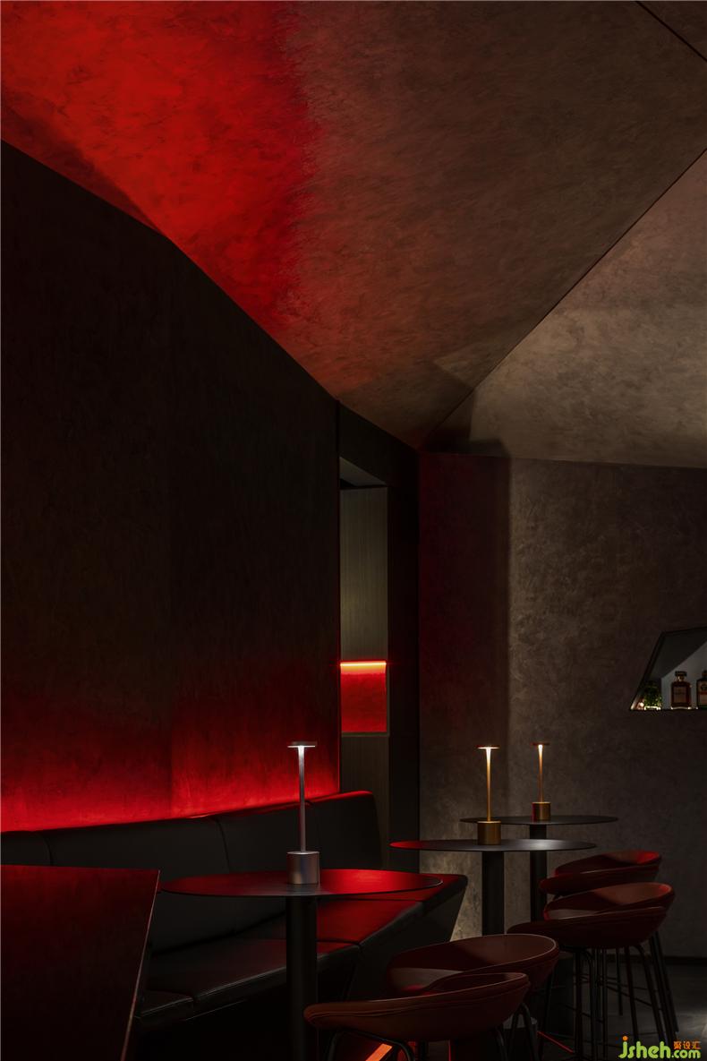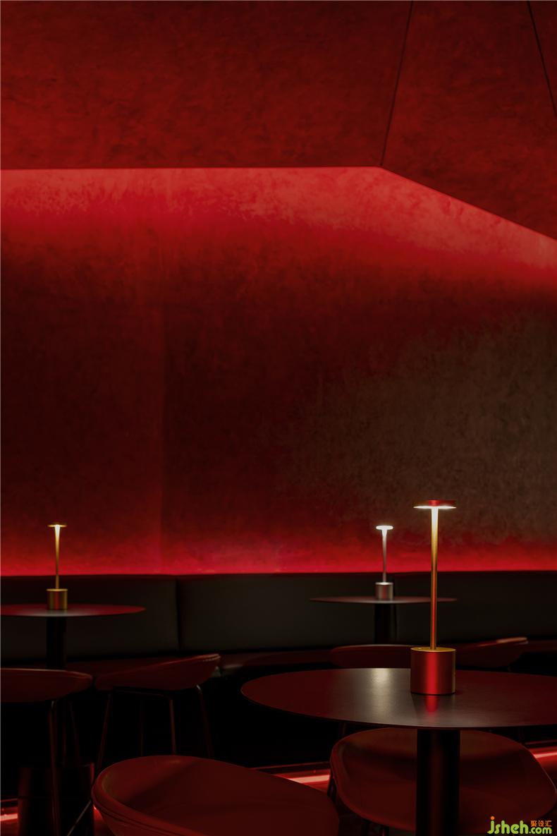 如果说餐厅是一个神秘高贵的优雅佳人,餐厅设计酒馆则更像是爽快奔放的摩登女郎,大方的用红色灯光铺盖整个空间,彰显自己的热情