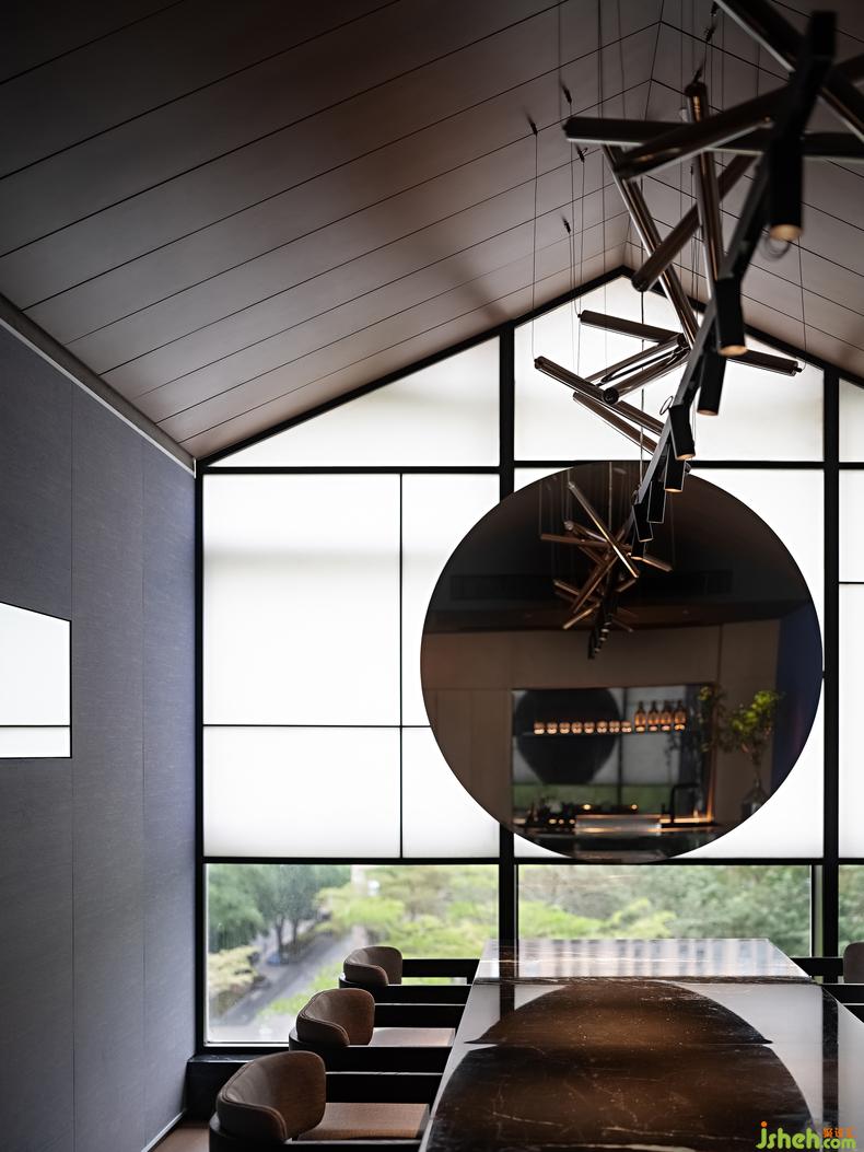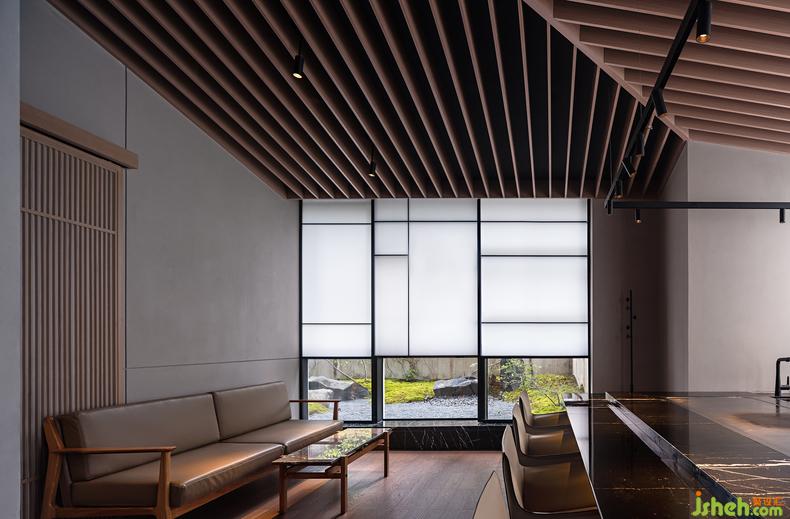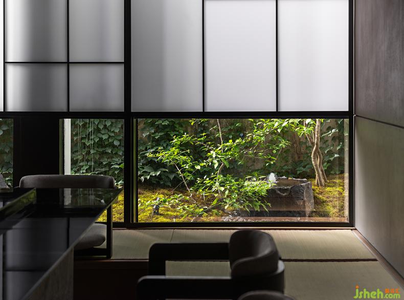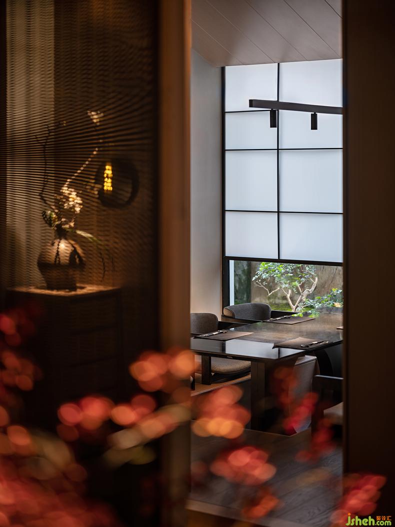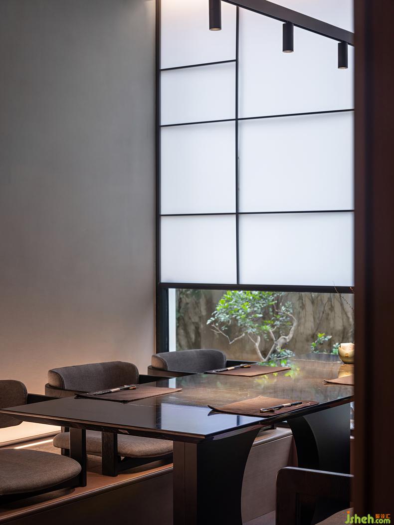 这一间日料餐厅设计最大的房在建筑的边角,两面窗,一面正对庭院,另一面可见街道的树梢。