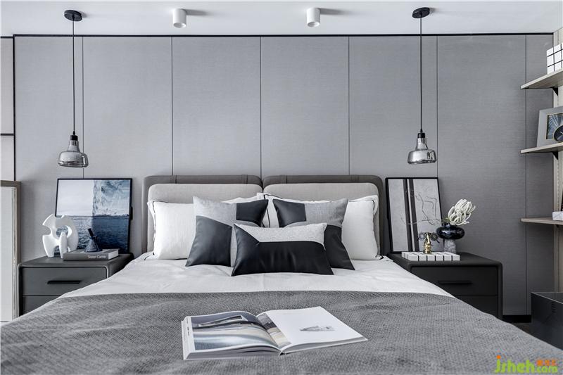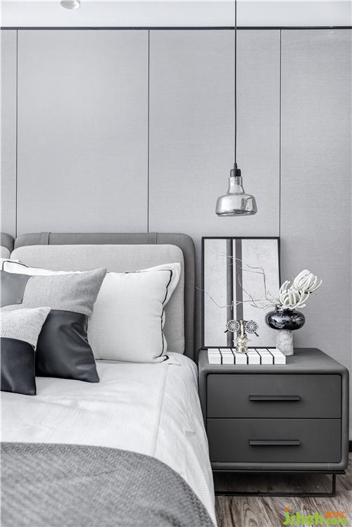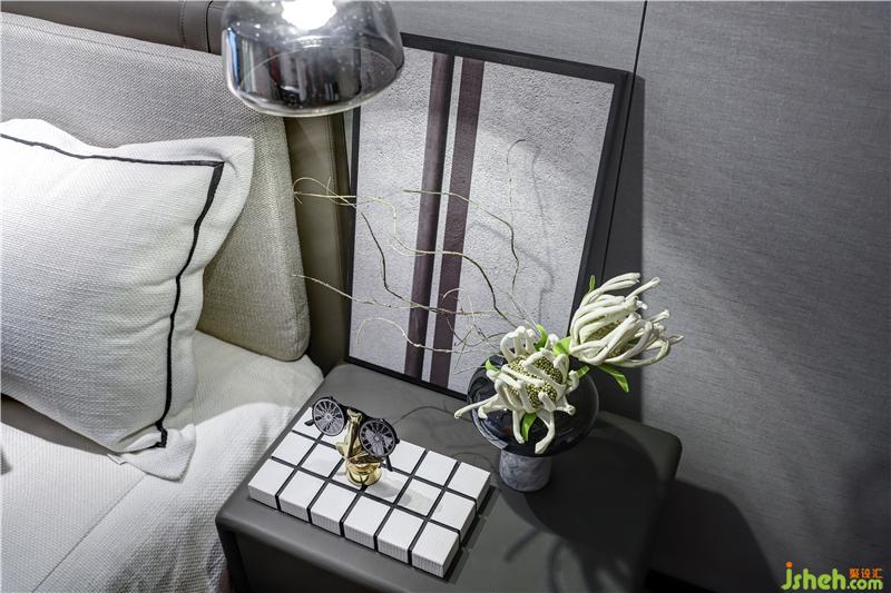 楼上的卧室也延续了整体的高级灰色调,用金属色作点缀