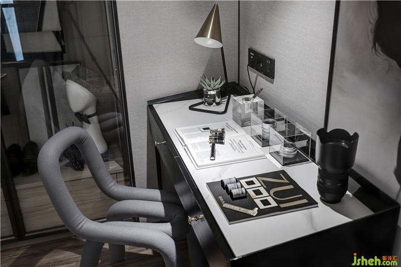 室内设计师在书桌旁竖立着一幅黑白人物装饰画