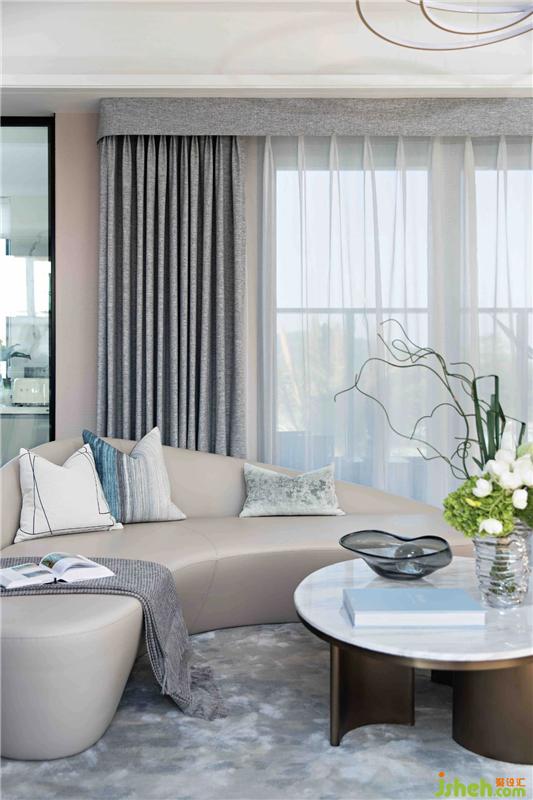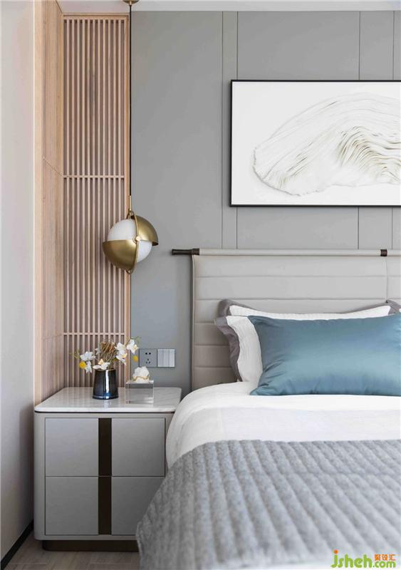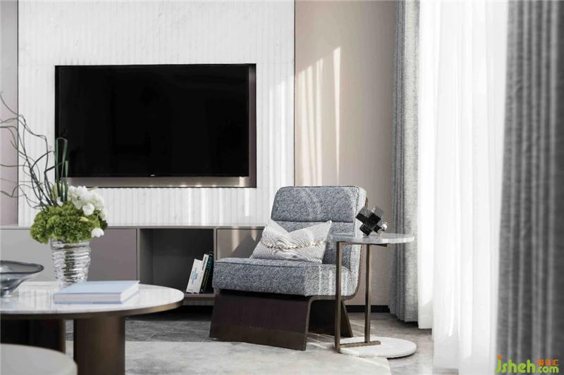 不同层次高级灰的色彩运用,结合细致的几何纵向线条,铺排出极具现代感的美学风尚,黄铜质感的金属饰品勾连起空间的艺术想象。