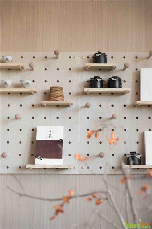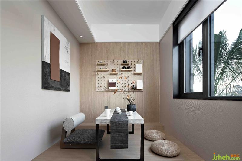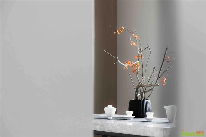 茶室尽显中式儒雅,契合居者对禅意生活的向往与追求;桌腿的矩形设计打破传统的条形桌腿的刻板印象,与弧形椅背形成巧妙的视觉差。