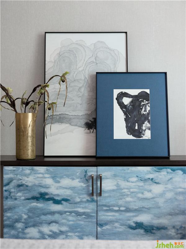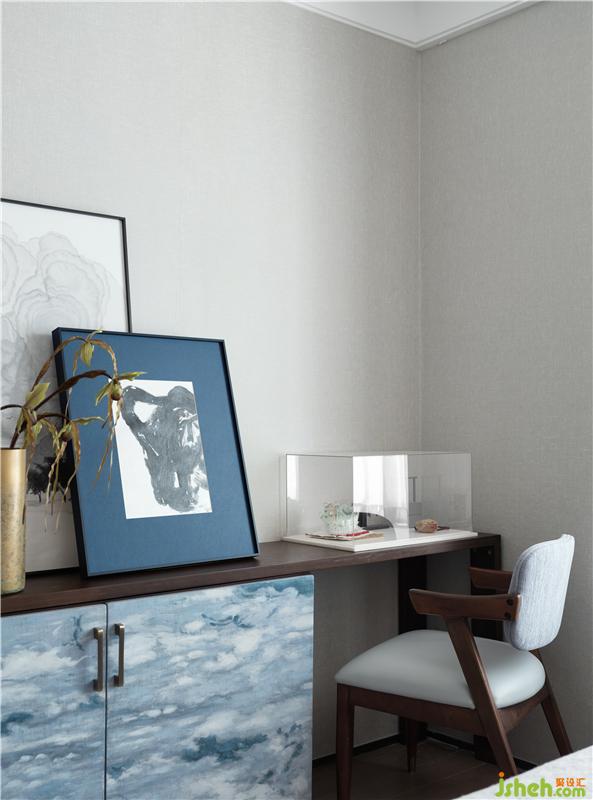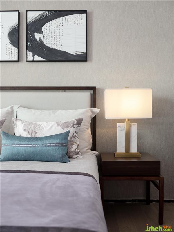 次卧空间质朴素雅,背景墙上的装饰画极富东方韵味,挥笔落下,墨色蜿蜒出刚劲的力道,将传统文化的细腻绘于空间之中,增添了视觉的层次感。