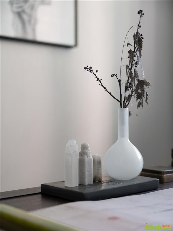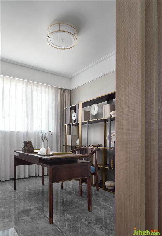 深色的大理石地板,让空间多了些沉稳,颇具东方韵味的一桌一椅则在静静诉说着禅式意境。而空间中金属的点缀,则让中式风格的古色古香与现代风格的精致简约自然衔接,缔造出了亦古亦今的绝妙氛围。