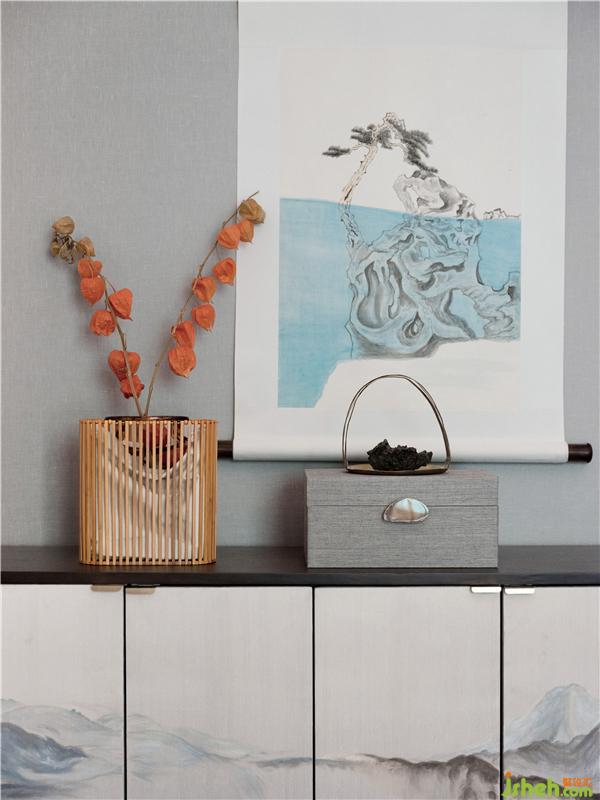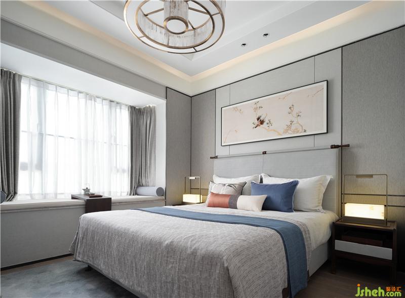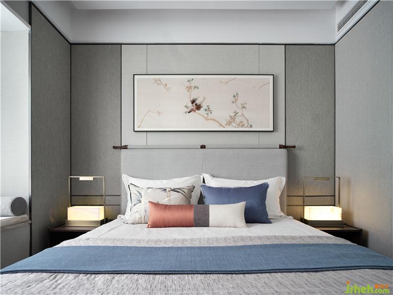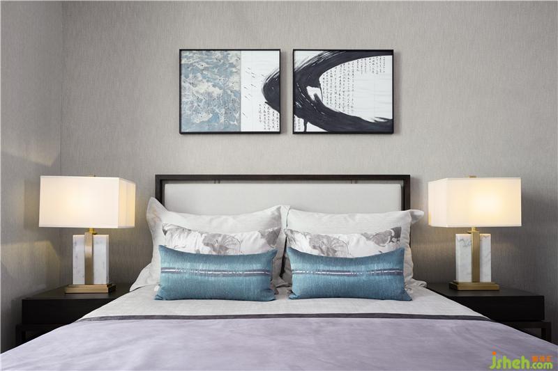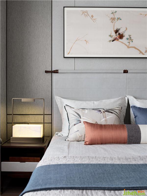 主卧空间以灰色为主要基调,内敛而低调。床头以画卷为造型,不仅别致,亦凸显了空间的文化与内涵。背景墙上的装饰画气韵十足,栩栩如生,恍若蝉鸣轻唱近在咫尺,令人感到惬意与放松,营造出了舒适无压的空间感。