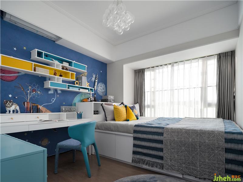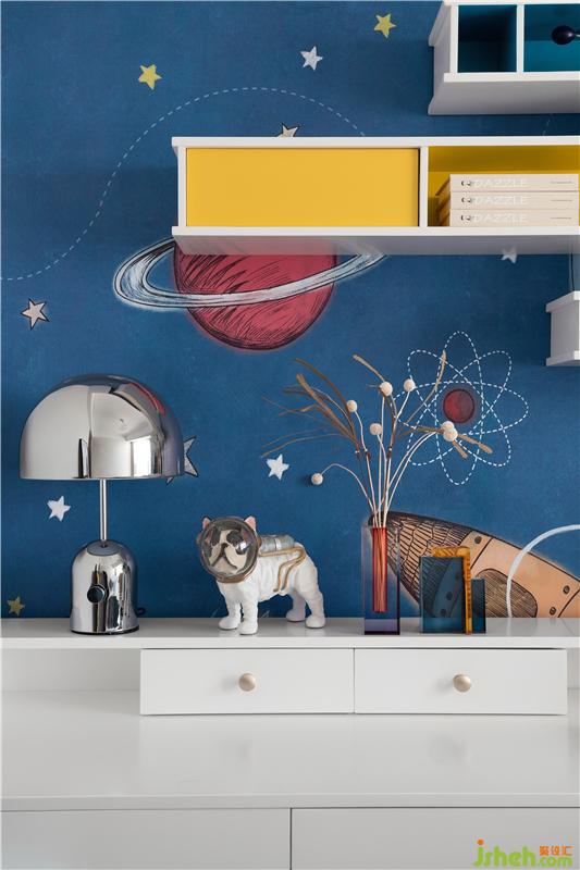 精心绘制的星际太空墙面则充满了天马行空的想象力,床头的火箭摆件,桌子上带着宇航头盔的小狗,都最大程度保留了孩子的童真与童趣。