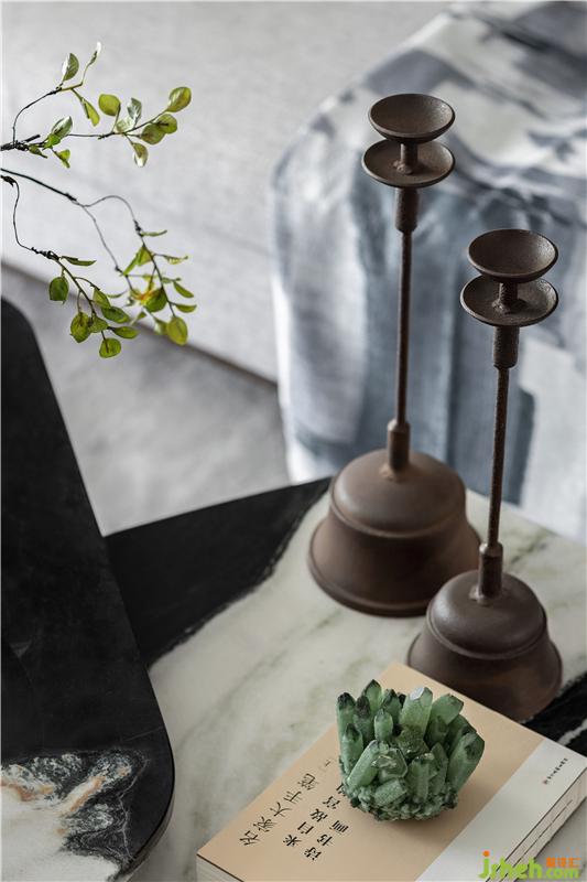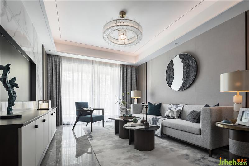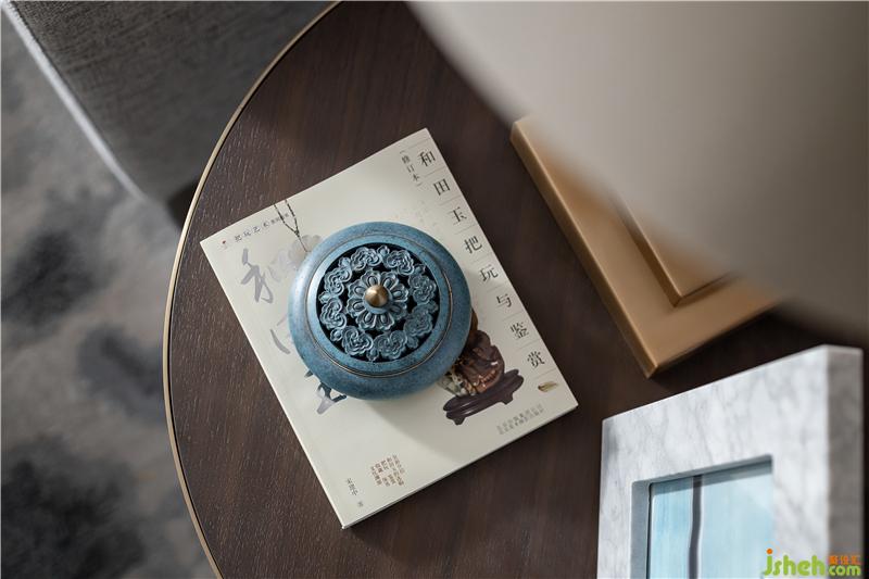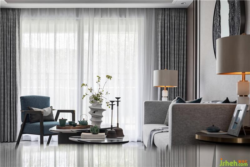 长沙样板房设计客厅氛围淡雅而不清寂,儒雅的东方美感,意境空灵,碧色茶盏、湛蓝香炉、生机绿植、皆于含蓄内敛中书写生活的温度,并赋予了空间细腻的优雅。