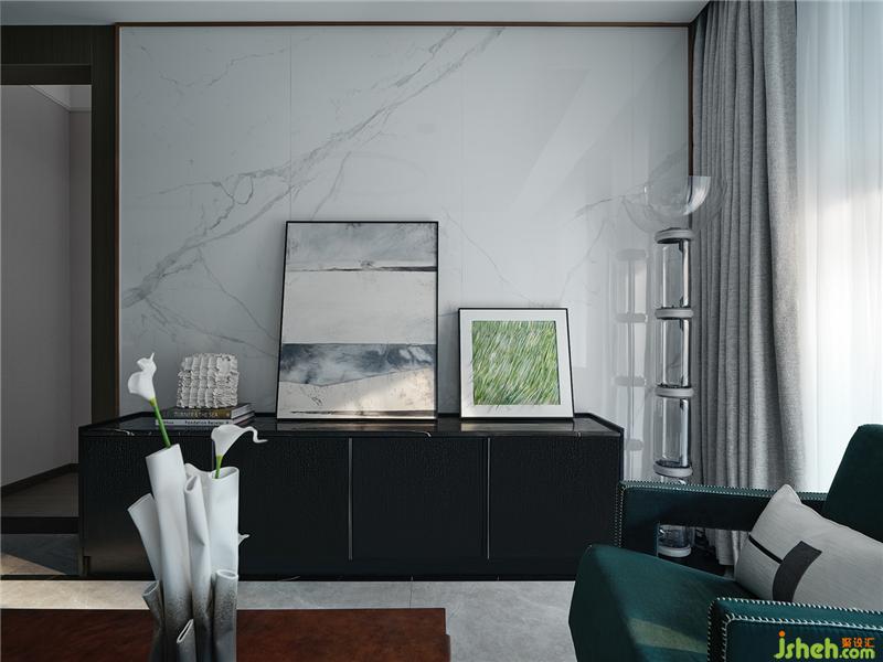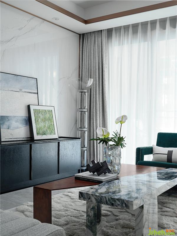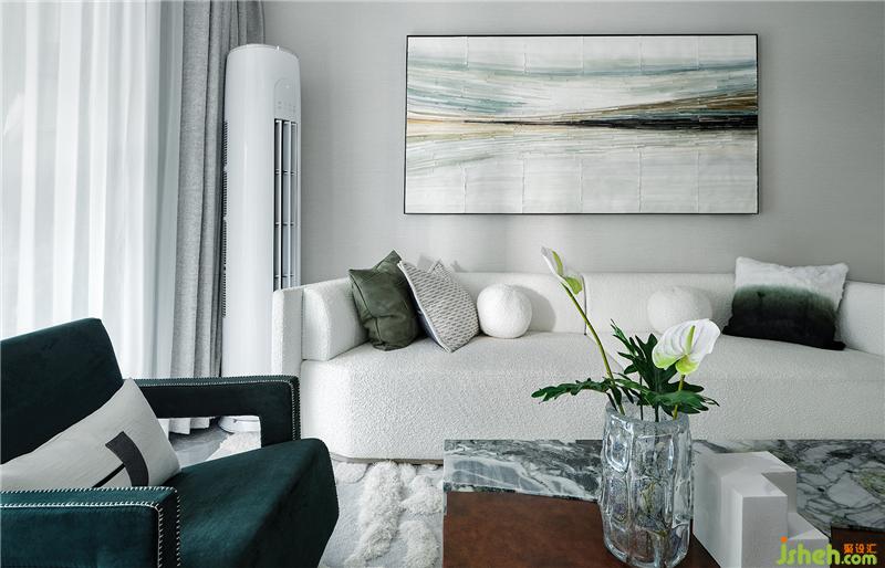 纯洁无暇的白色铺陈为底,样板房设计选用深浅不一的绿色系加以点缀,自然之感即随之渐渐散发出来,使室内瞬时焕发生机。独特的茶几造型,由天然原木和纹路交错的优质大理石拼接而成,与整体空间的自然质朴之感呼应成趣。精心挑选的油画则使空间多了一份艺术的洒脱,可谓是一处点睛之笔。