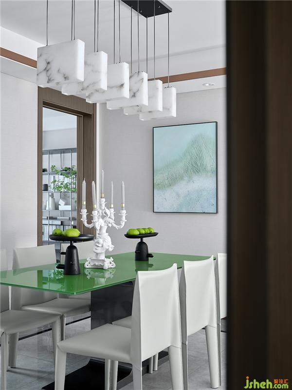 转身步入餐厅区,一片翡翠绿瞬间映入眼帘,心情不禁豁然开朗。顶部大理石肌理的吊灯提升了用餐者的格调,雕刻工艺的烛光摆台使得自然与艺术得以共生。