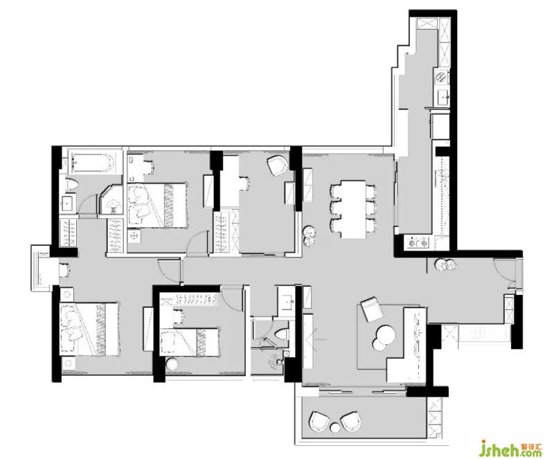 视觉均衡,是设计中经常运用到的一种视觉规律。本案的设计是更好的为居住者打造出一个舒适的居住环境,在空间整体结构相对合理的情况下,设计师通过细节对房子结构上进行调整,以达到视觉上的均衡。室内设计师
