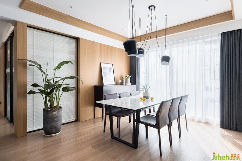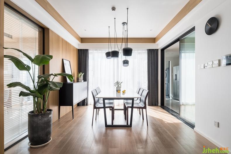 玄关处黑框玻璃的设置使客厅在视觉上有了延长和开阔的效果,原木色系的KD饰面板也在无形中划分了餐厅与客厅的区域,层次递进。