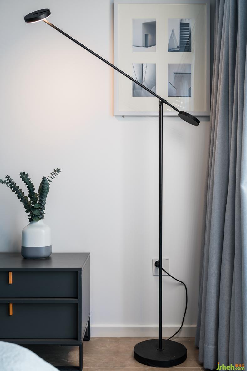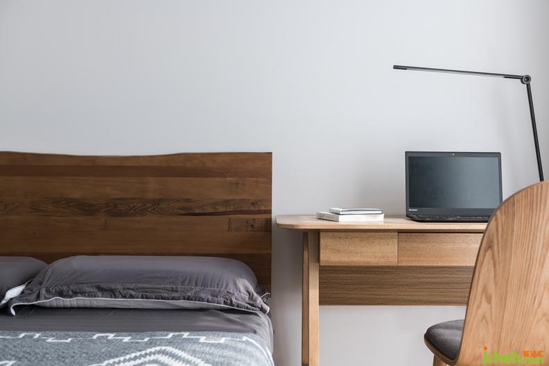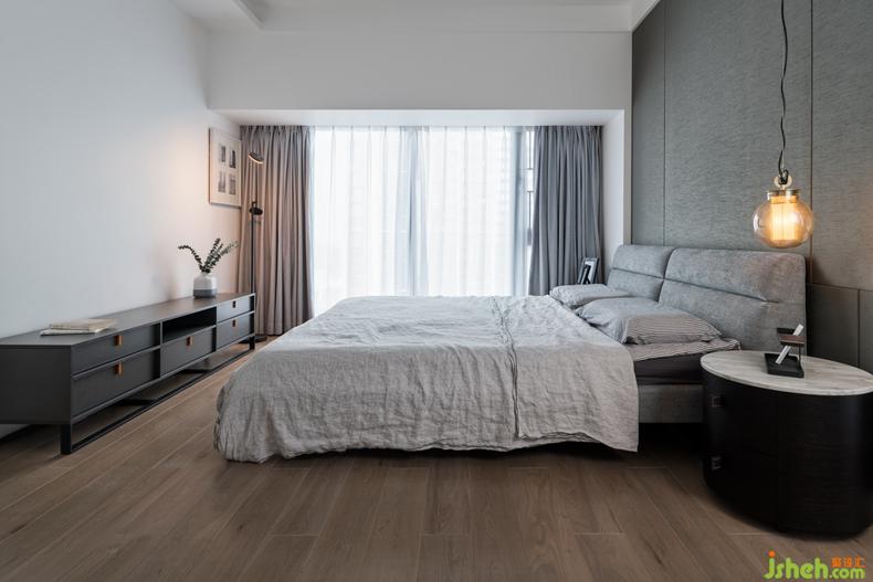 从温润如玉的性格到她笃信的眼神里,大家对R小姐的印象是“人生一如初见”。所以,主卧的设计主要从他们的性格出发。黑色的坚韧和灰色的安静作为主色调,延续了客厅灰色电视背景墙的设计,主卧也采用了一面墙的硬包。考虑到主卧的色调相对沉重所以床头柜的选择上会比较慎重。